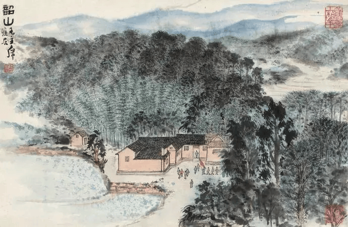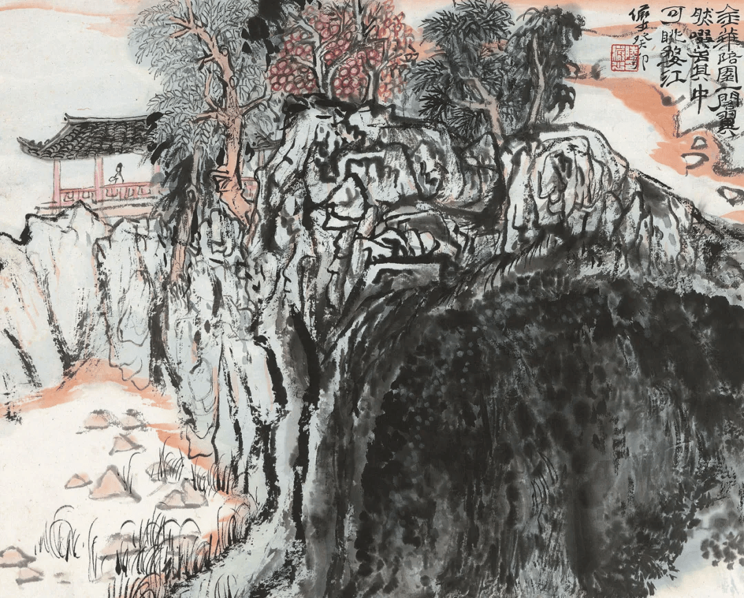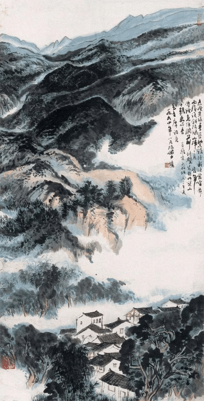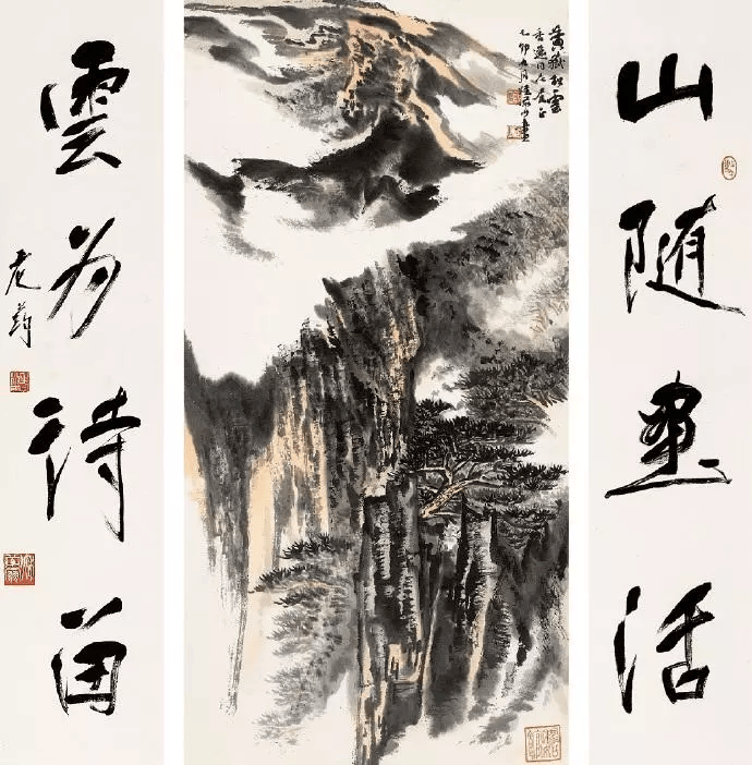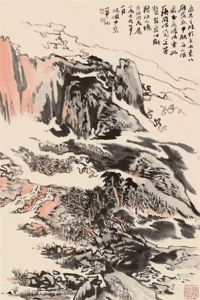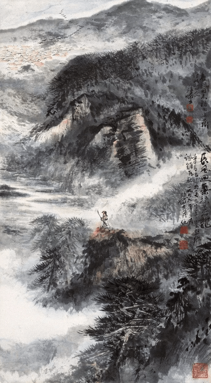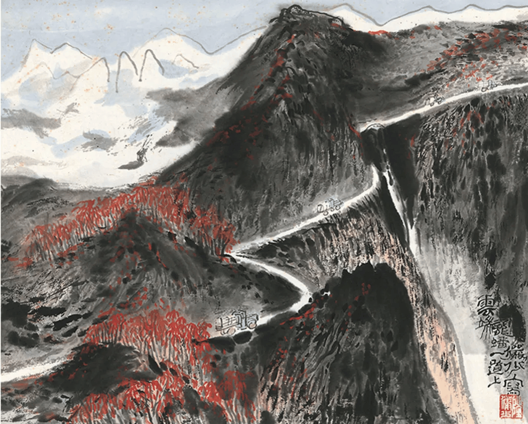 陆俨少是海上画派的重要代表人物,他的笔墨层次丰富,气韵生动,线条变化流动,意境卓绝。他曾说:画云水,用笔要流畅飞动,和山石在笔墨上形成尖锐的对比,使动者益动,静者益静。独特的云水法、留白法, 多变的章法取势, 将诗、书、画放于并重的地位, 并能很好地将其融合在一起。他在深入师法传统的基础上通过大量的写生与体验生活, 在自然的观察学习中敢于创立新法, 给传统山水画带来新的笔墨语言, 但并非拘泥于某一家某一派, 也并没有传统文人画家那种崇南抑北的思想, 继而确立了其山水画独特的艺术面目, 形成了极具个性的“陆家山水”。