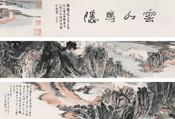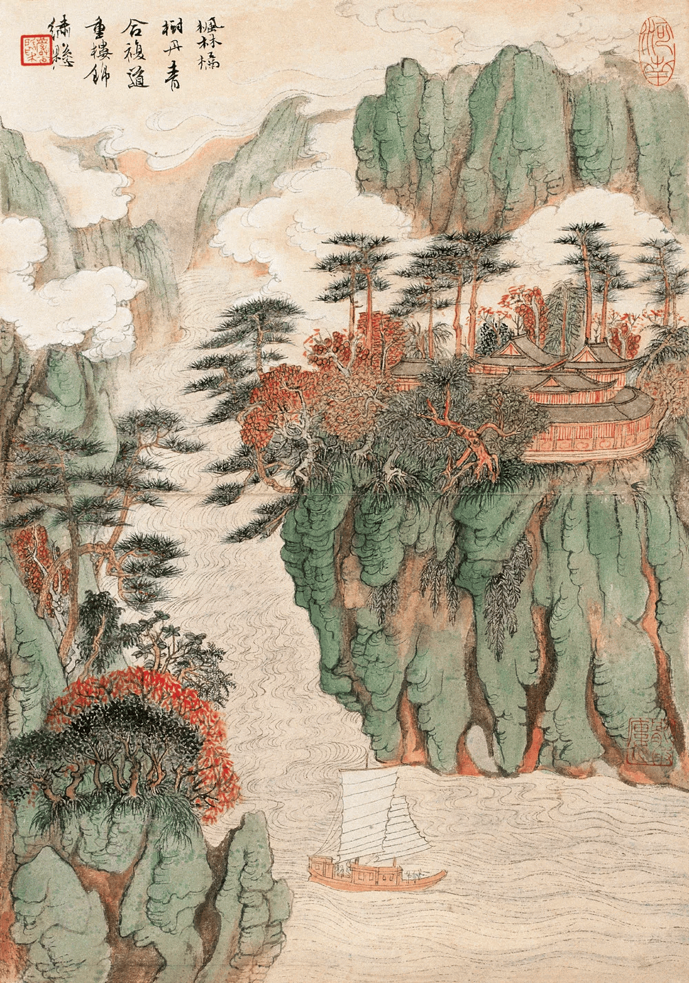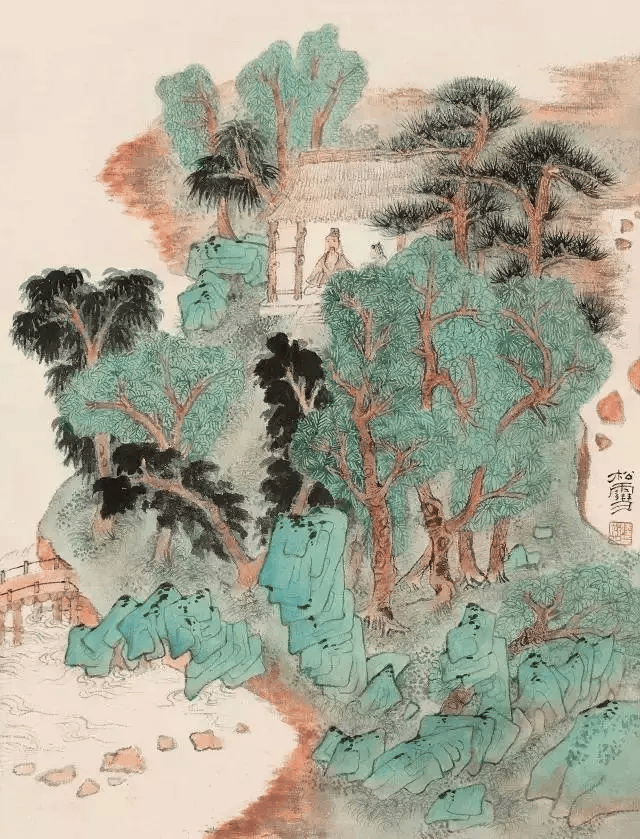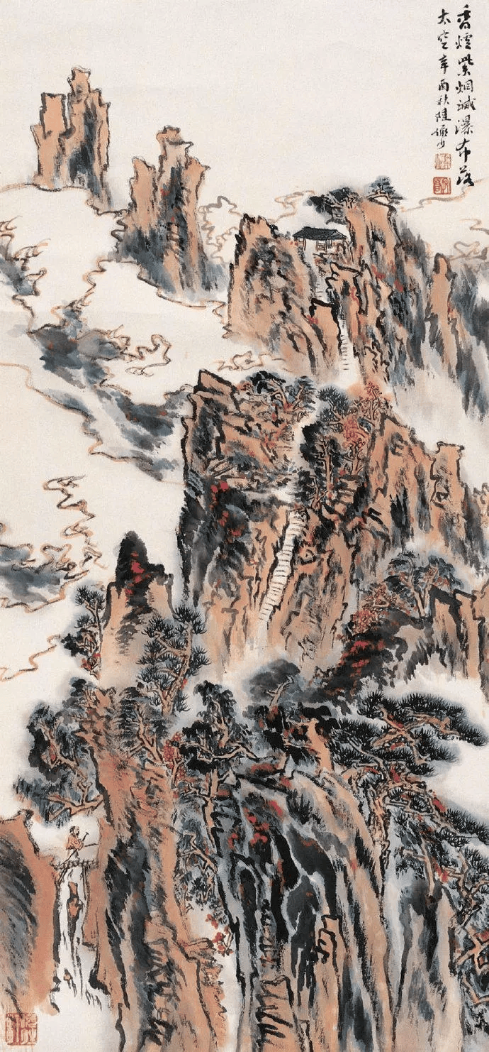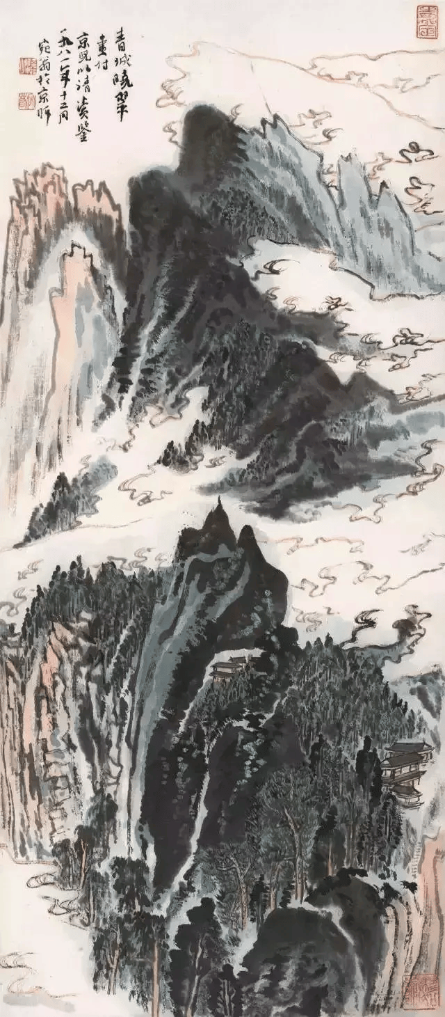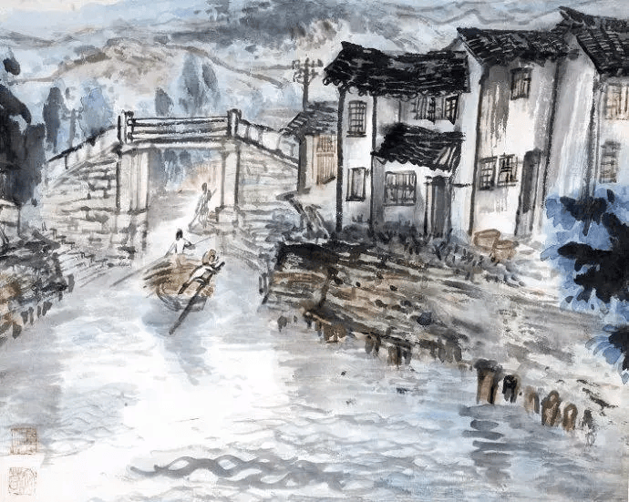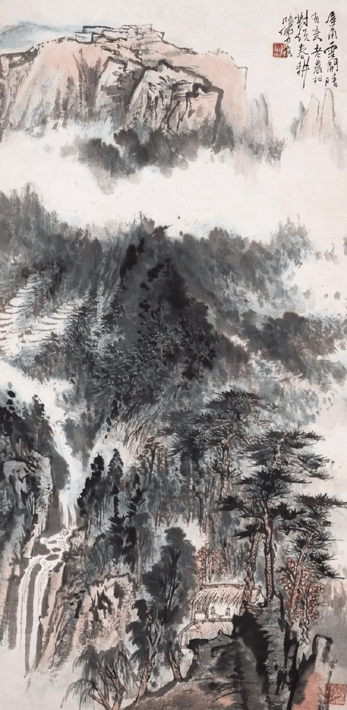 陆俨少是海上画派的重要代表人物,他的笔墨层次丰富,气韵生动,线条变化流动,意境卓绝。他曾说:画云水,用笔要流畅飞动,和山石在笔墨上形成尖锐的对比,使动者益动,静者益静。独特的云水法、留白法, 多变的章法取势, 将诗、书、画放于并重的地位, 并能很好地将其融合在一起。他在深入师法传统的基础上通过大量的写生与体验生活, 在自然的观察学习中敢于创立新法, 给传统山水画带来新的笔墨语言, 但并非拘泥于某一家某一派, 也并没有传统文人画家那种崇南抑北的思想, 继而确立了其山水画独特的艺术面目, 形成了极具个性的“陆家山水”。