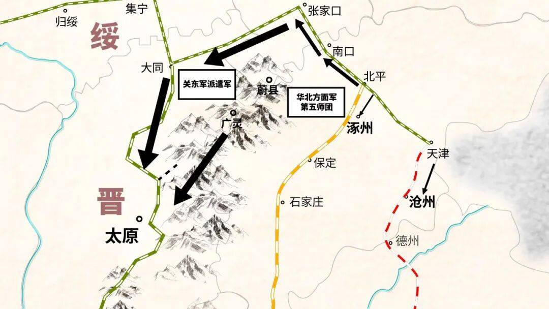 当时,华北战场上日寇的攻势,从平津作辐射状指向3个方面:一路沿平汉路向涿州,一路沿津浦路向沧州,一路则放在晋绥方面。进攻晋绥的是主力,分两路:一路是关东军派遣军,在攻陷南口和张家口后,沿着平绥路扑向大同;一路是华北方面军第五师团,占领蔚县后向广灵方面疾趋内长城,企图从两翼合击太原,占领山西。日寇占领山西,可消除对华北平原居高临下的威慑之势,同时可占有丰富的矿产和粮食。