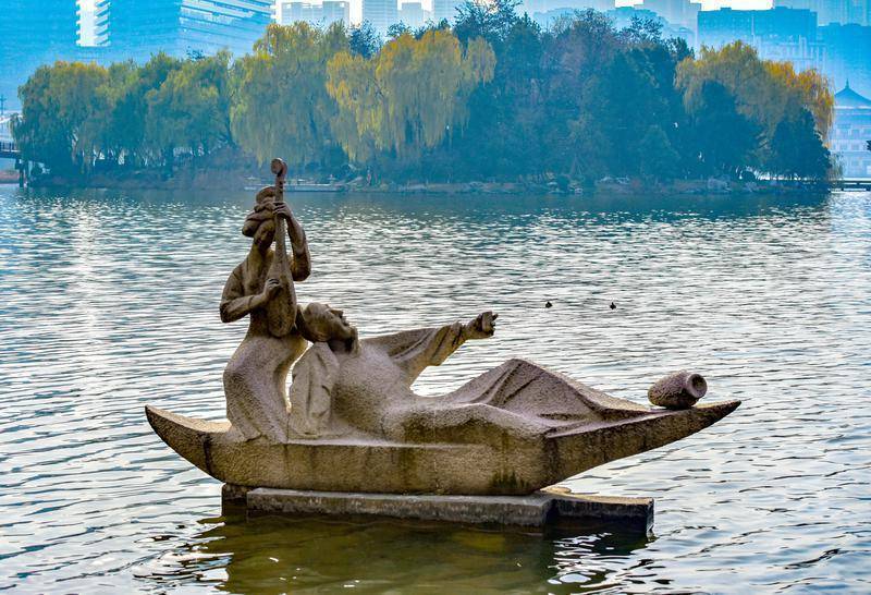 初冬午后,金黄的银杏叶在青石板路上铺成地毯,引领着众人走向那座著名的“醉卧诗人”雕塑。几个孩子正围着雕塑嬉戏,其中一个调皮地摸了摸诗人高挽的发髻——那是杜甫,正以他最自在的姿态,永远醉卧在曲江池畔。