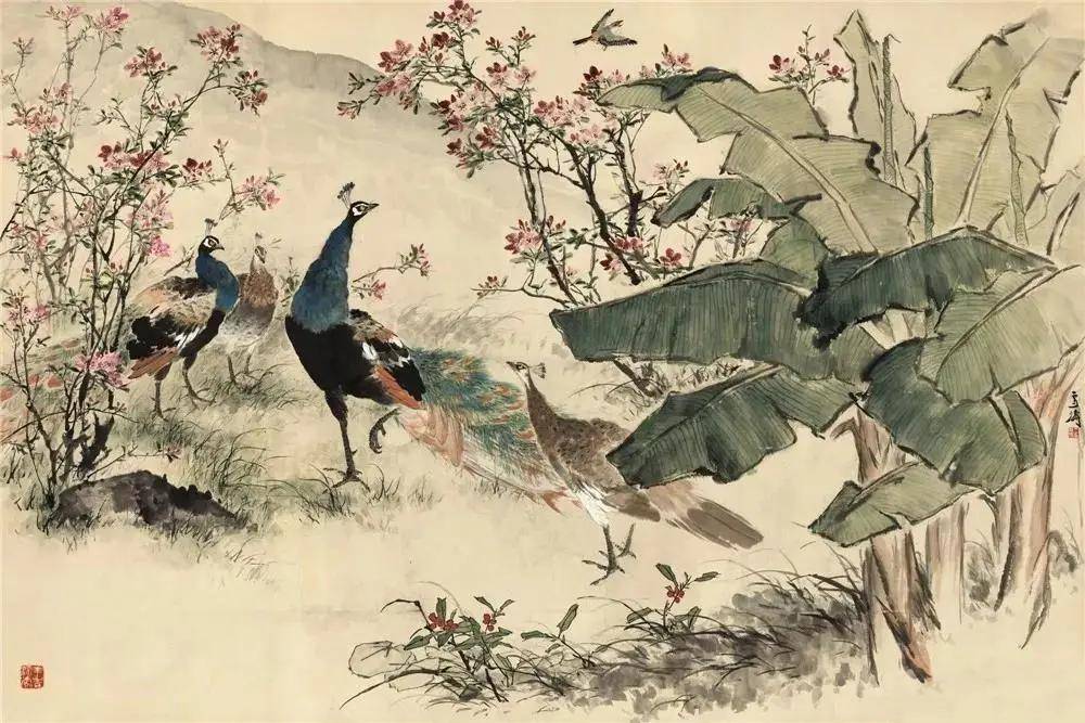 写生是王雪涛写意精神的根基,脱离自然的写意终将沦为无源之水。其艺术扎根于对自然的深度热爱与细致观察,通过画笔将一草一木、一虫一鸟的生机意趣,真诚呈现在观众眼前。他一生笃信“画家当以自然为师,写生即写心”,这份坚守让其写意始终饱含自然生机,从未陷入空洞的笔墨游戏。其写生绝非对景摹写的简单复制,而是“观其形、悟其神、凝于笔”的深度转化:为捕捉蝴蝶振翅的瞬间情态,他于郊野蹲守半日,紧盯翅翼在光影下的开合节奏;为细察螳螂、蝈蝈的肌理动态,便将这类小生灵养于案头,日夜静观其爬行、捕食的姿态,记其神情、辨其肌理,把自然生灵的鲜活瞬间深烙于心。这份对自然的虔诚体察,最终成为其写意创作的坚实底气,使他笔下的花鸟虫鱼皆具“本真之态”,无程式化的刻板模样。《云南山麓》是写生与写意融合的典范,画面中热带花卉的舒展姿态、禽鸟的互动情态,皆源自实地观察却绝非简单再现——藤蔓缠绕的走势是对生命韧性的提炼,花朵色彩的层次是对自然光影的归纳,笔墨写意间暗藏写生所得的细节,既留存了自然本真的质感,更实现了艺术审美的提炼升华。即便是铁线莲、鹦鹉雉鸡这类寻常物象,在他笔下也各具情态:藤蔓中锋行笔如活水流动,花朵没骨点染似轻云覆雪,鹦鹉羽色艳而不俗,雉鸡姿态警觉灵动,每一笔皆见写生功底的深厚,每一处意趣皆源自对自然生灵的深刻体悟。