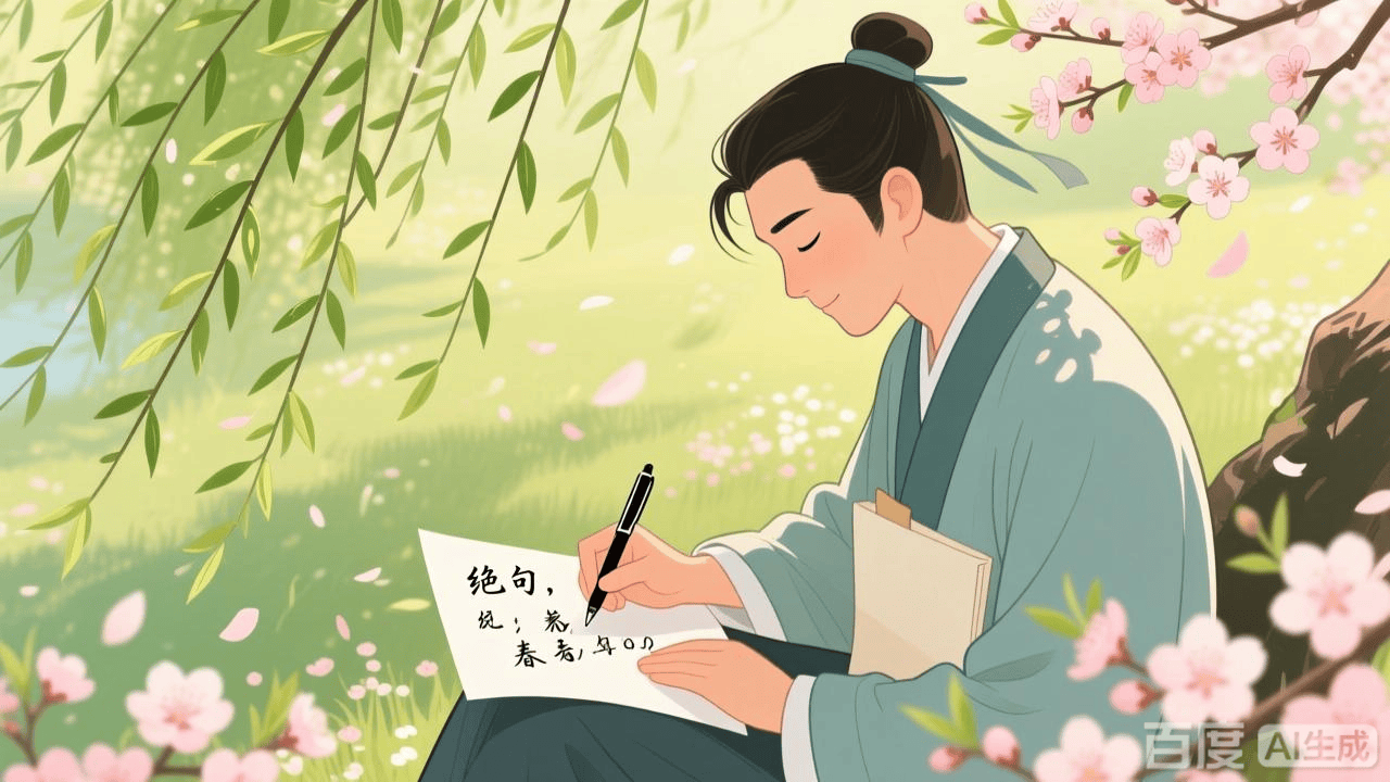 他停下脚步,闭上眼睛,静静地感受着这美好的一切。突然,灵感如泉水般涌上心头,他赶忙从怀中掏出纸笔,写下了这首《绝句》。他把自己在这春日里的所见、所感,都巧妙地融入到了这短短的诗句之中。