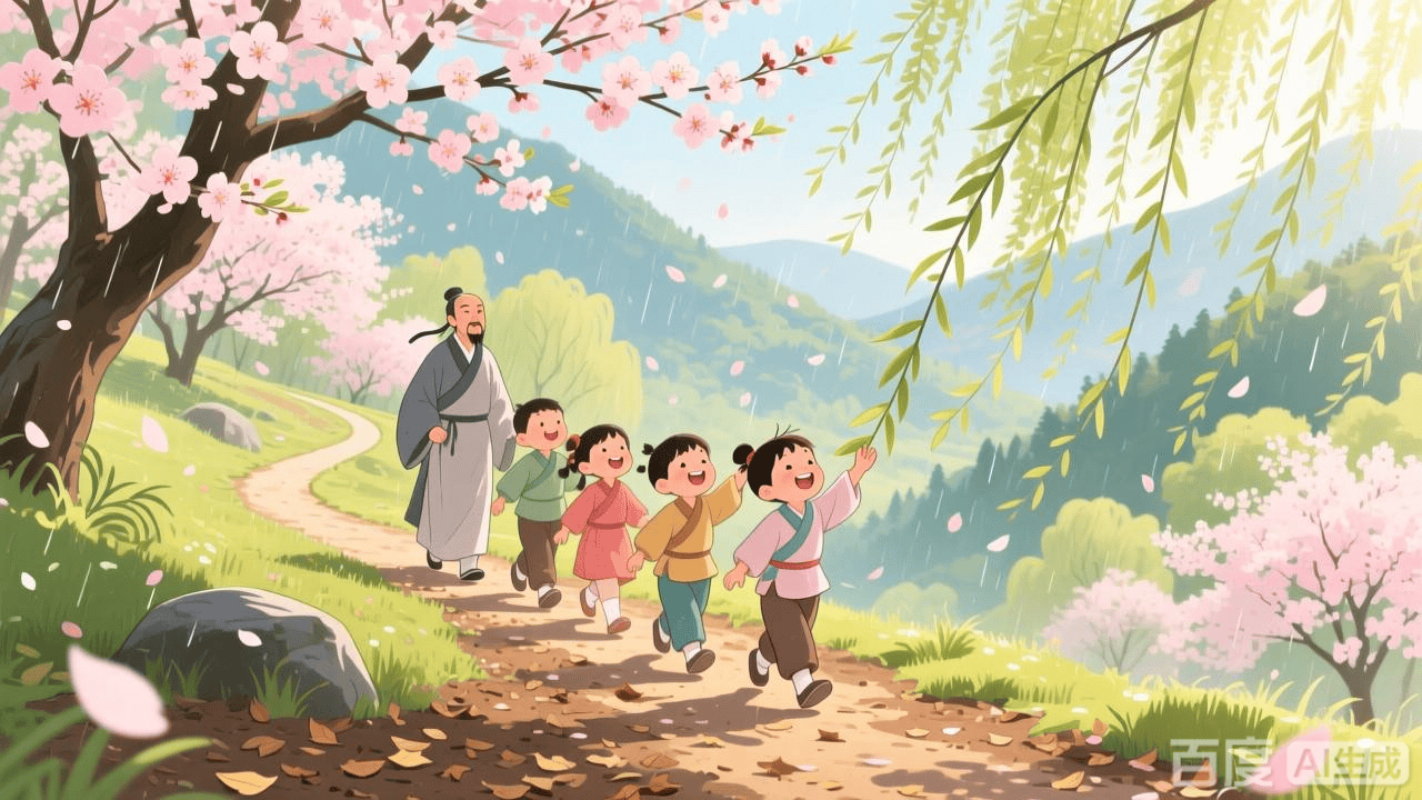 后来,这首诗流传开来,人们都被诗中描绘的细腻春景所打动。小朋友们读着它,仿佛也能跟着释志南一起,漫步在那充满生机的春日山林,感受那杏花雨的轻柔、杨柳风的温暖。