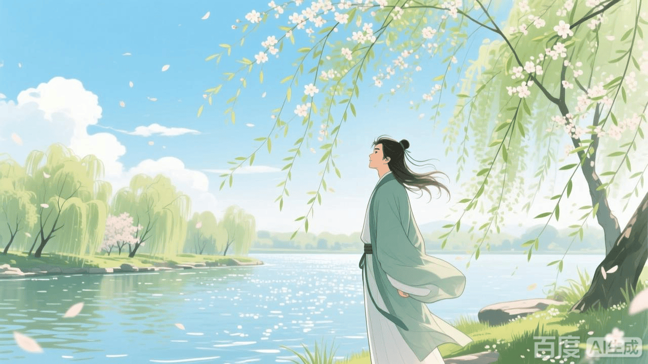 同时,轻柔的春风拂过脸颊,就像母亲的手轻轻抚摸,带着杨柳的清新气息,没有一丝寒意。释志南被这如诗如画的春景深深陶醉了。