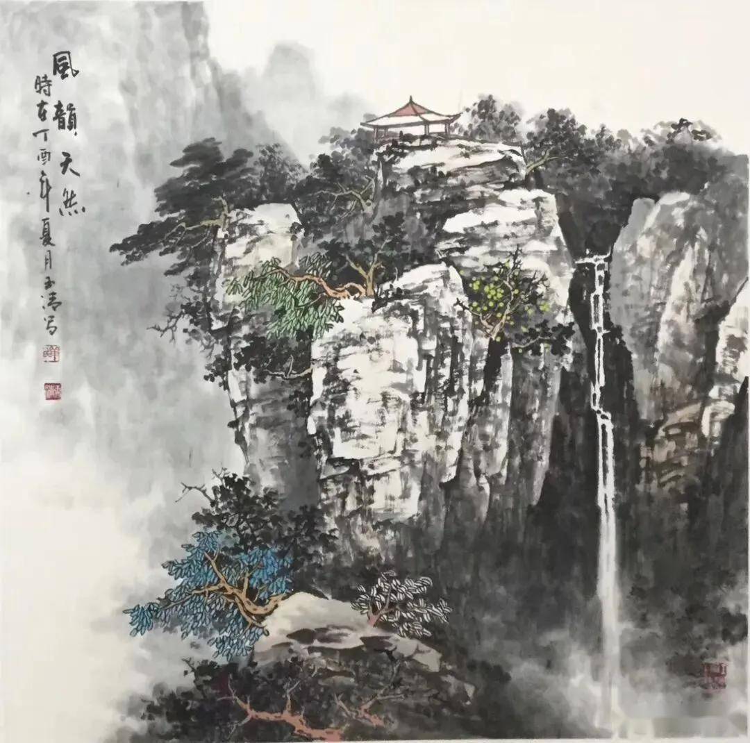画中危崖皴以折带,白瀑如练垂空,松分青蓝二色,亭翼然于岩巅,题 “风韵天然”,恰合 “清水出芙蓉,天然去雕饰” 之旨。其构以平远法展瀑流,翠松破墨而出,色不艳而清,显 “天趣” 之妙。此作喻 “本色为贵”:松之色、瀑之形,皆不事雕琢,正如君子立身,守其本真,则风韵自显。昔王维画《辋川图》,亦以素笔写天然,此作承其 “诗中有画” 之脉,观之如闻松风瀑语。