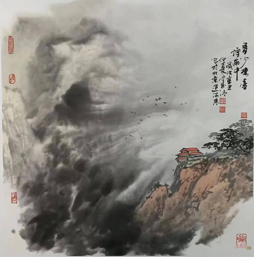 是图以泼墨写云,墨气氤氲如混沌初开,孤亭立于丹崖,鸿雁掠云而过,题款 “亭立千峰”,有 “孤峰独秀,不与众山伍” 之概。技法上以没骨法混墨色,云之虚与亭之实相衬,朱亭一点,如心灯照夜。