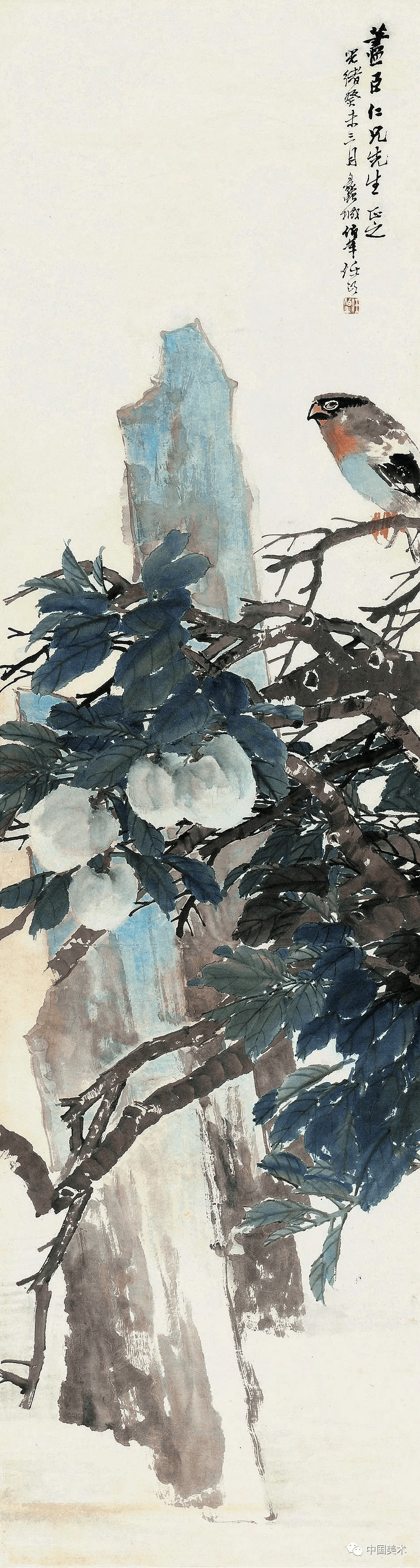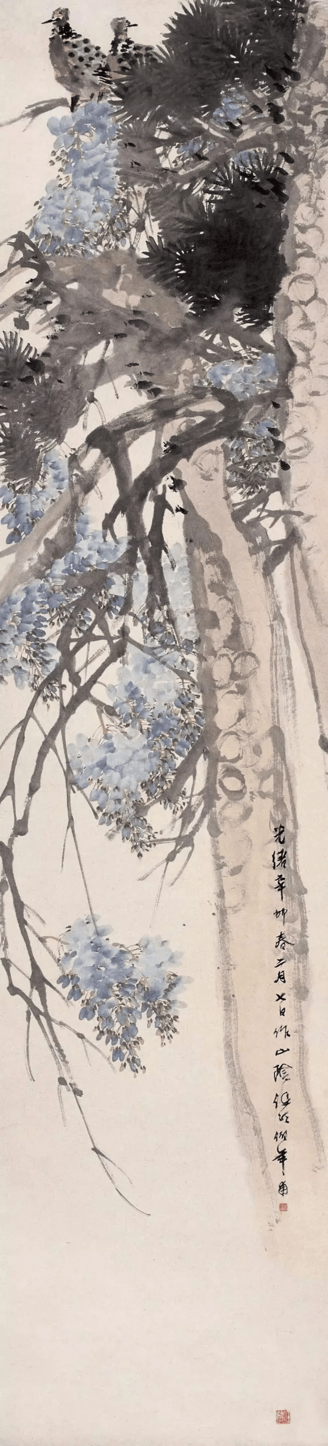 任伯年《松藤双鸠》1891年 215.4×49.3厘米