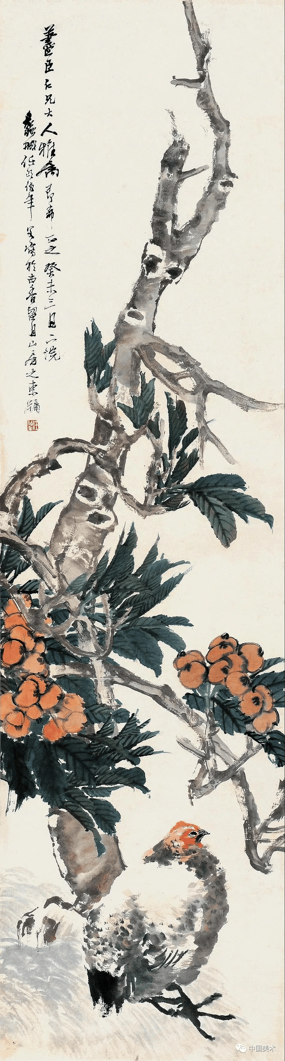 任伯年《枇杷猫雀图》1884年 136.5×32.9厘米