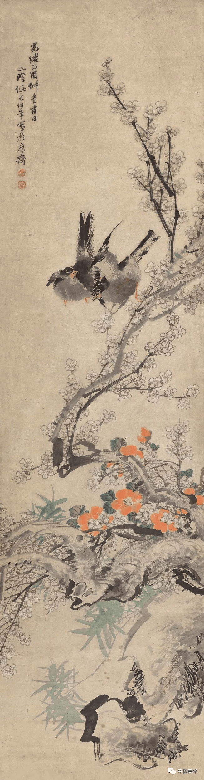 清 任伯年 梅雀图立轴纸本40x150