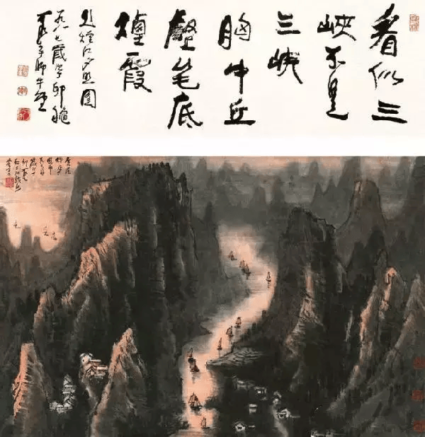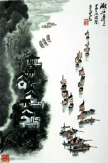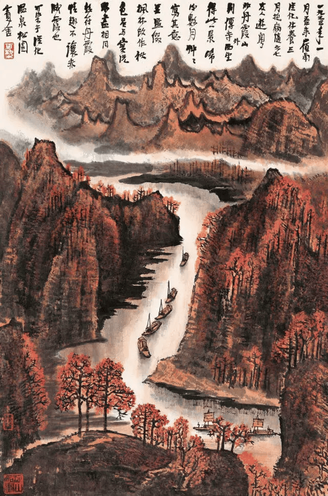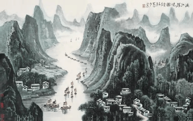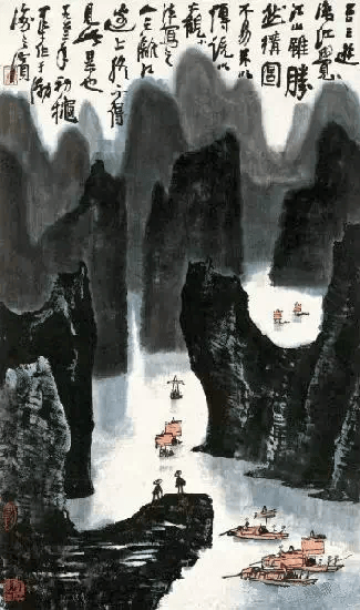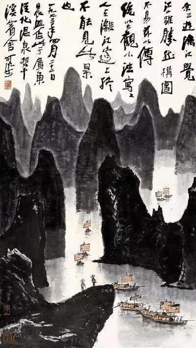 奇秀的漓江山水,画家“以传统以大观小法写之”,减弱焦点透视造成前大后小的视觉效果,俯仰周览,生成独特的意境。