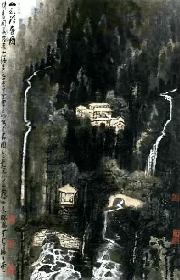 此画描绘的是雨后山村飞瀑鸣泉的常见之景。以墨与色的明暗变化交待出空间层次,使空间由远及近逐步推进。近景的树木带有一种逆光的效果,树梢闪动着莹绿的光晕。砖拱石桥是画面唯一的暖色,桥下的黑色岩石和明亮的溪流又与远处的山林瀑布相映,使画面统一在深邃宁静的意境中,仿佛能够在空蒙的深山中听到泉水的叮咚声。