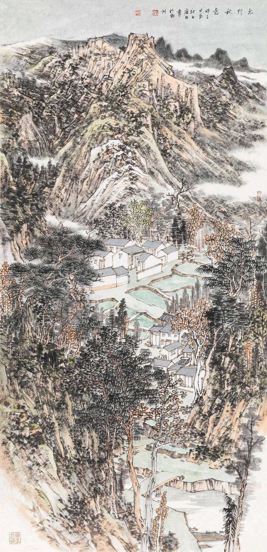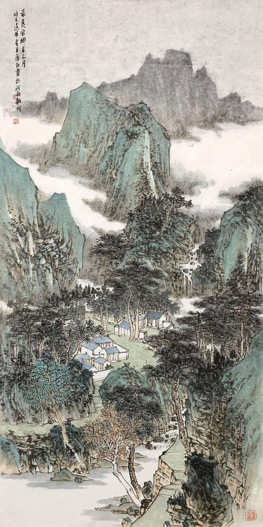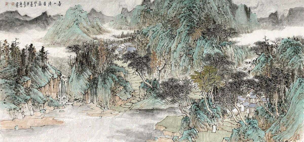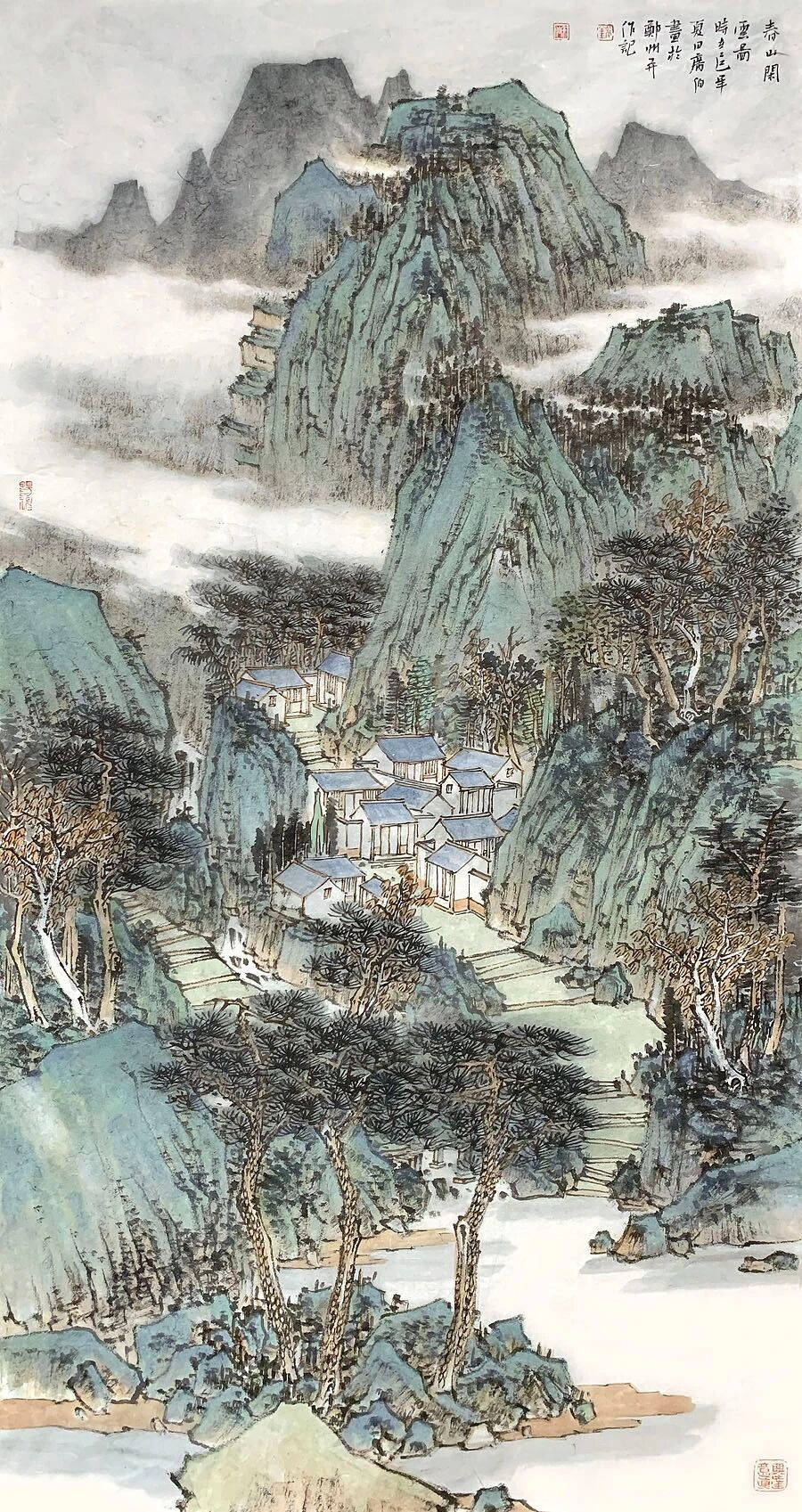 这技法哪里是 “承袭古法” 可束?是把青绿的雅揉进烟火的暖,把皴擦的刚融成晕染的柔;是让山有了岁月的痕,云有了流动的姿,村落有了生活的温。他的画是四季的容器:春藏在松梢的翠里,夏裹在溪涧的凉里,秋栖在叶尖的黄里,冬卧在崖壁的雪里,而人间的暖,就藏在每一扇半开的窗、每一道蜿蜒的径里。