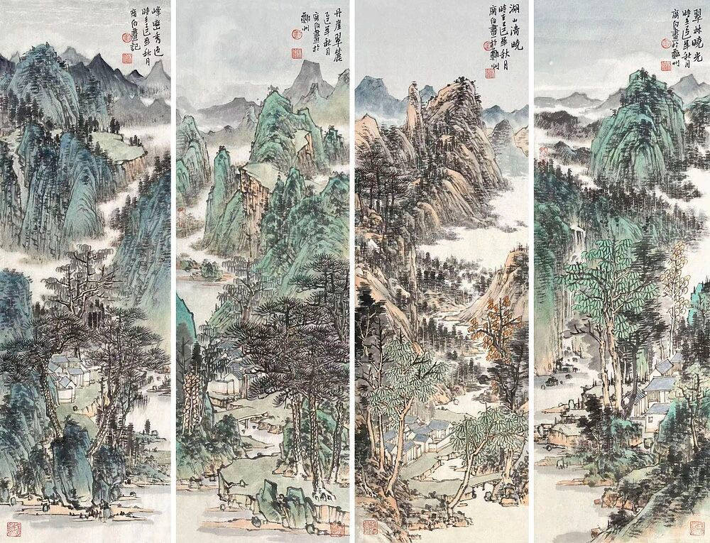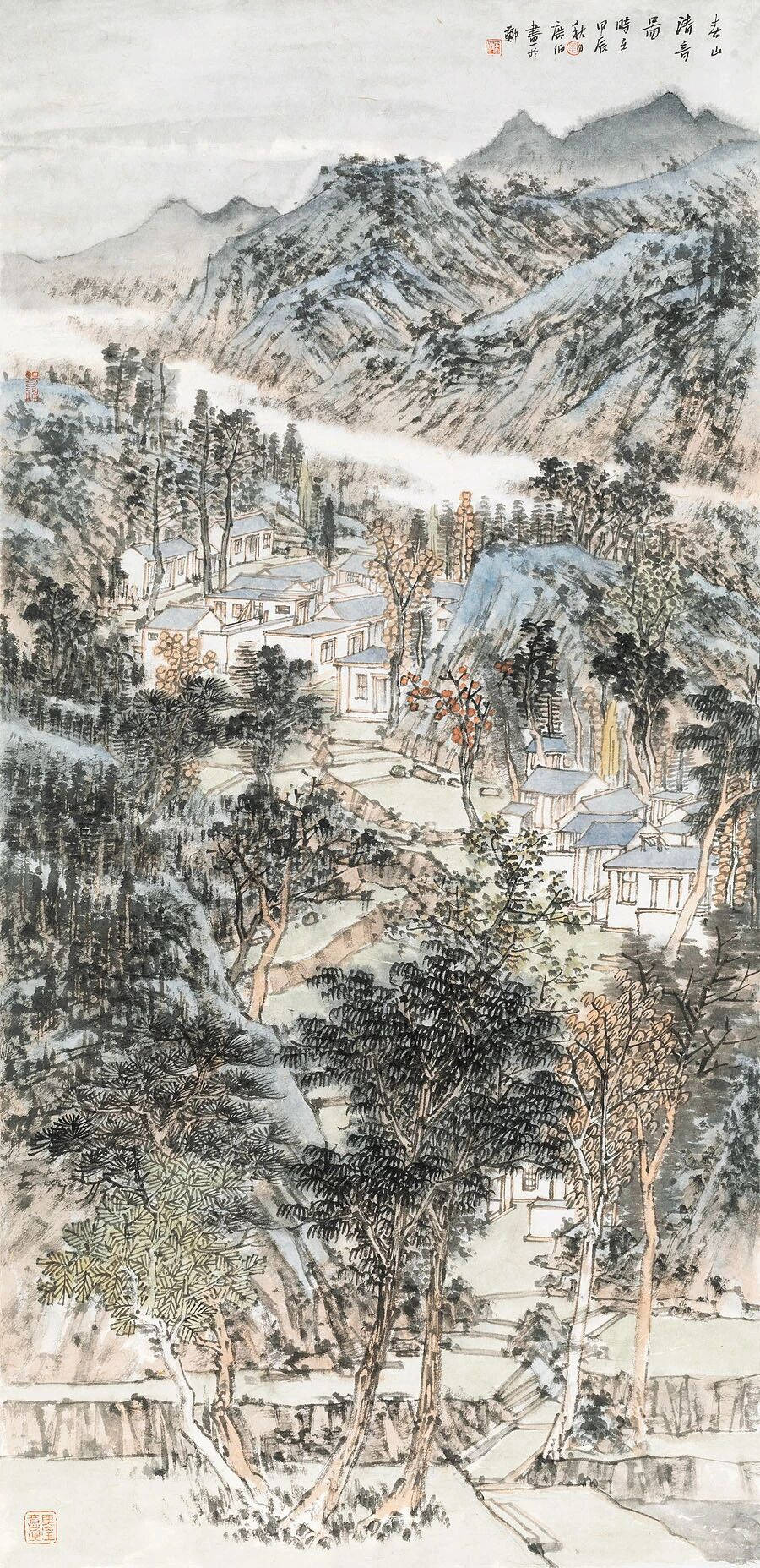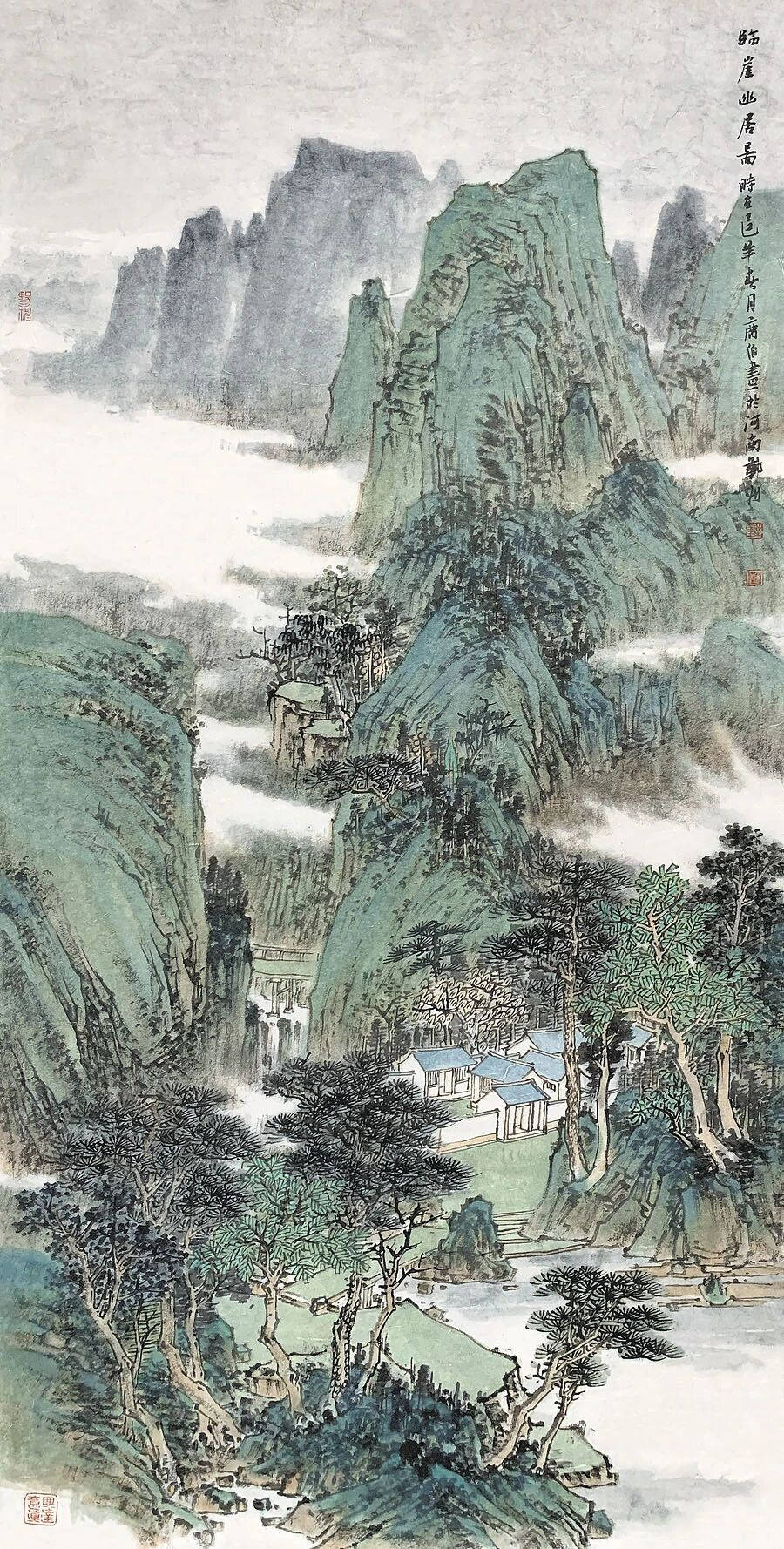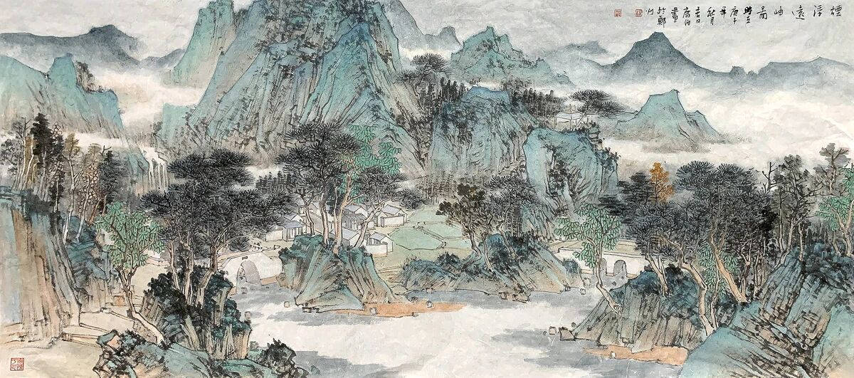 这技法哪里是 “承袭古法” 可束?是把青绿的雅揉进烟火的暖,把皴擦的刚融成晕染的柔;是让山有了岁月的痕,云有了流动的姿,村落有了生活的温。他的画是四季的容器:春藏在松梢的翠里,夏裹在溪涧的凉里,秋栖在叶尖的黄里,冬卧在崖壁的雪里,而人间的暖,就藏在每一扇半开的窗、每一道蜿蜒的径里。