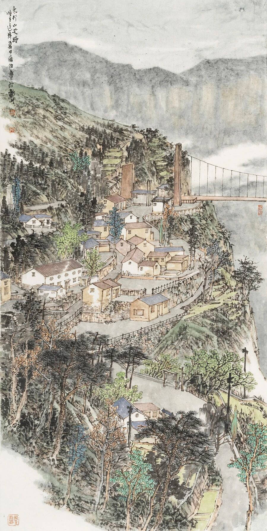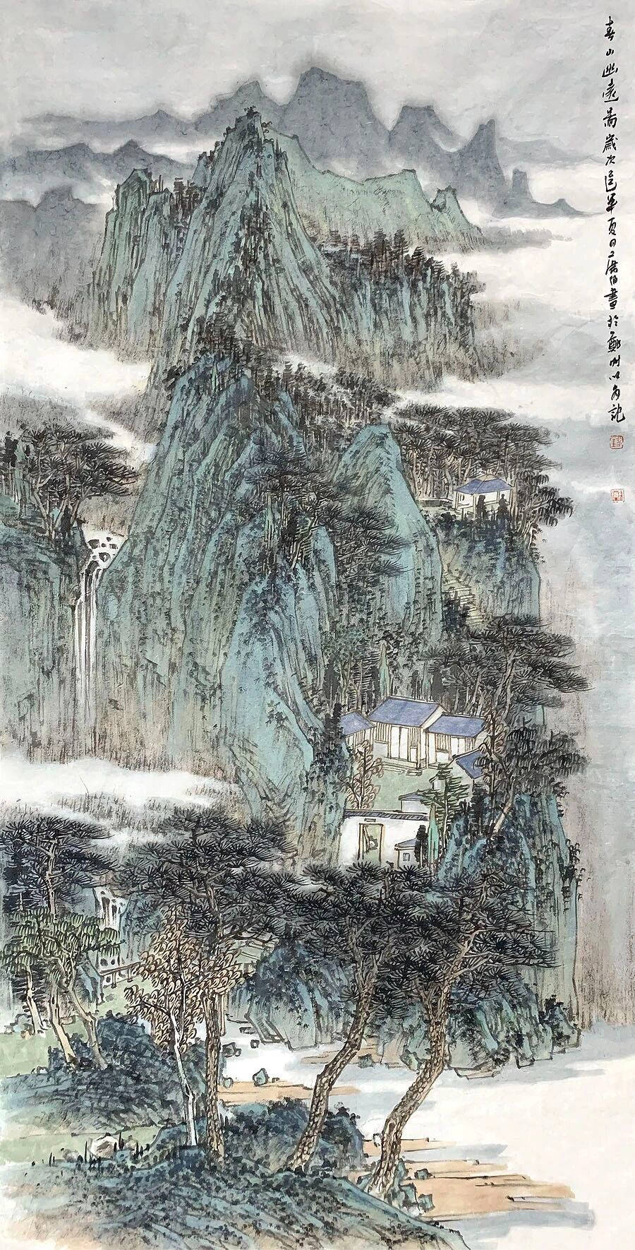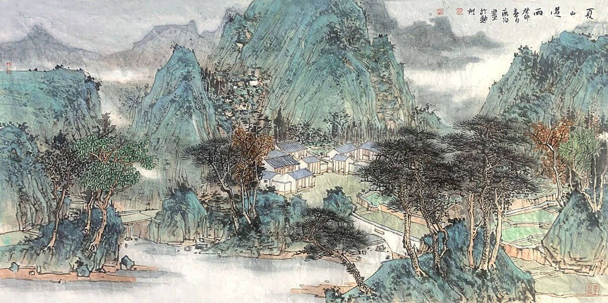 你看他笔下的青绿峰峦,是揉碎的翡翠浸了晨雾,皴笔的纹理是风在崖壁刻下的诗行;松枝的浓墨是夜凝的云,梢头的淡翠是春吻过的痕,连藏在林麓间的村落,都似把烟火裹进了山的褶皱里。《夏山遇雨》的翠色,是把湖光泼向了峰峦,水纹的淡墨是揉碎的玉,石桥的线条是时光搭起的弦,一触便淌出溪声。这哪里是画,是把 “山水含情,村落藏暖” 的意趣,熬成了墨色里的呼吸:每一笔皴擦都是山的低语,每一层晕染都是云的轻吟,恰似蚕织锦缎,把灵韵织进了宣纸的经纬。