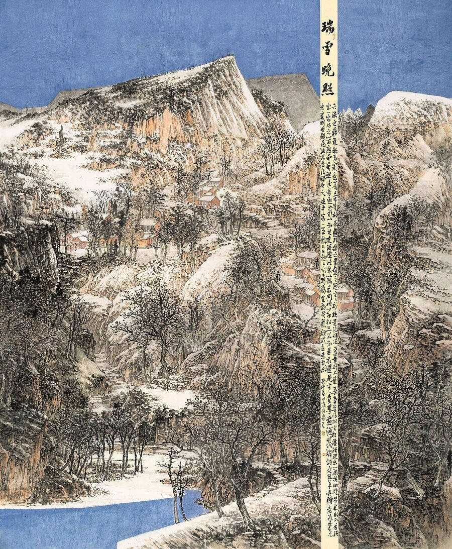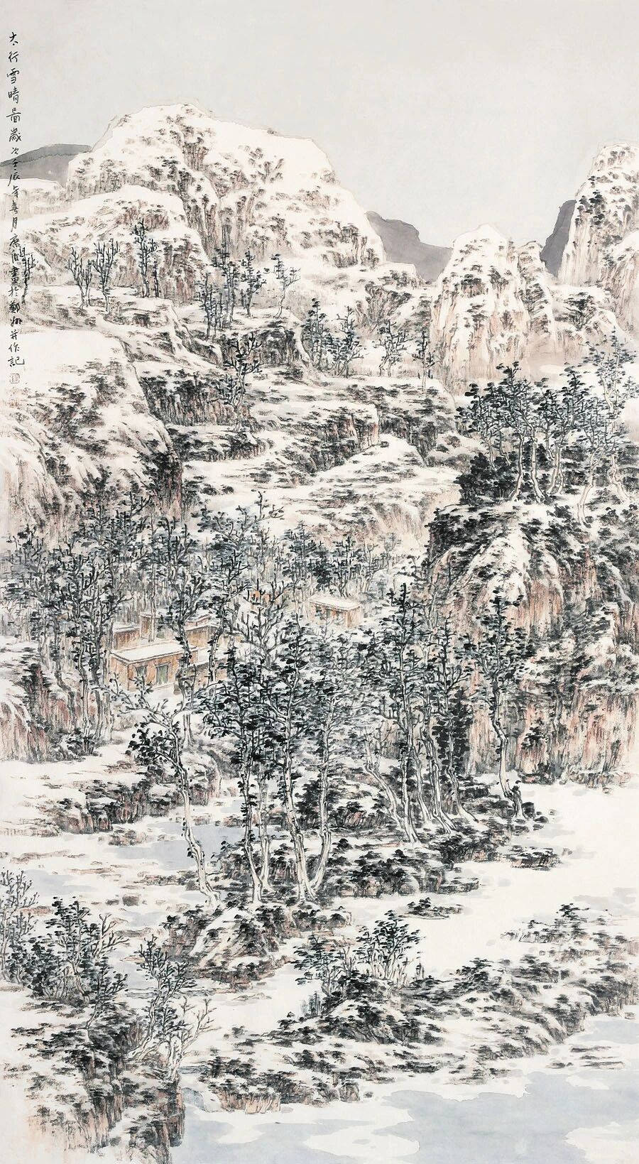 他的笔是通了四季的。《青山霁》的春雪,给树桠披了银纱,村落白墙是浸了晴光的棉;《瑞雪晚照》的冬峦,给崖壁覆了素帛,屋瓦淡褐是煨着的暖;《春山清韵》的新绿,给枝梢缀了星子,田埂浅黄是刚醒的土 —— 他把传统山水的皴法揉进工笔的细腻,线描的精谨是村落的骨,泼墨的洒脱是山云的魂,连题款的墨字都似山风捎来的信,落在画间便成了意境的注脚。
