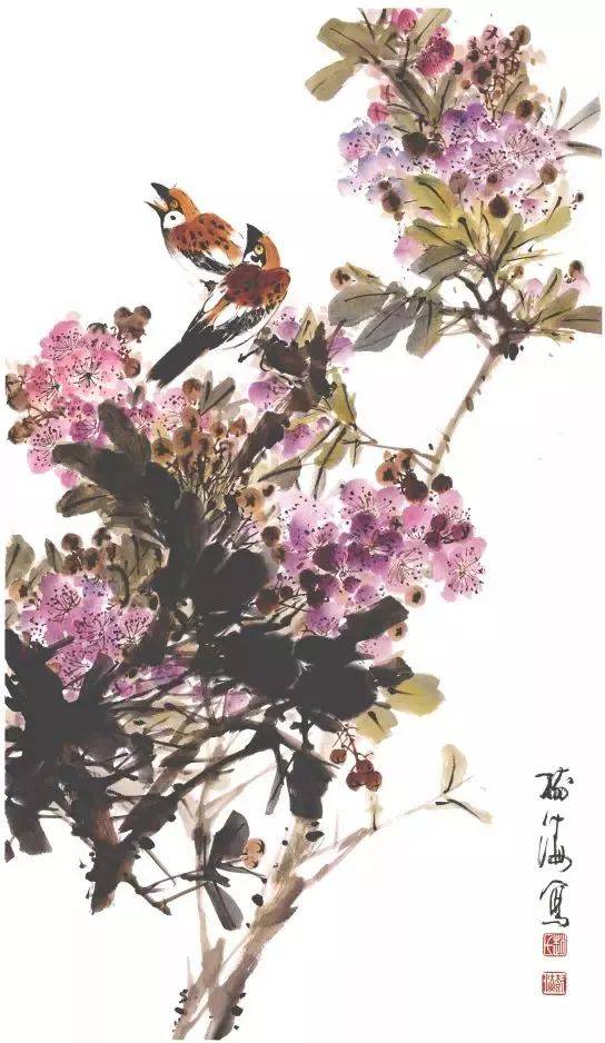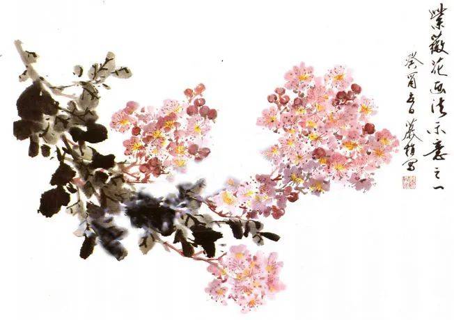 紫薇花以玫瑰紫色居多,有的又偏于粉红,花以碎笔点戳,为表现其密集簇生特点,写意画法一般是着眼于一束花的整体,不拘泥于一瓣一朵的的形态细节。所以是大面积的点染,用色要有浓淡、有层次,要干、湿结合,不能湿成一片紫。花瓣的点戳用色是以白粉蘸紫或蘸曙红分别按前后,间浓间淡地点写。笔上的水色不宜过多,多则易漫洇,难于控制花形。用笔宜碎,以秃笔点戳结合的方法点。多束花穿插一起,用色上要分前后远近,要有虚有实。