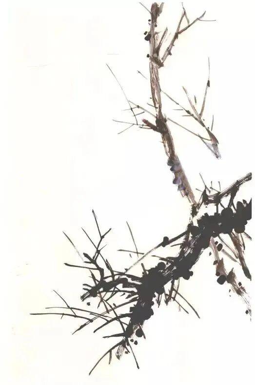 枝梗用淡墨或草绿蘸赭石勾写,嫩茎用草绿蘸胭脂勾连,主干用赭墨或墨侧锋逆行写出。