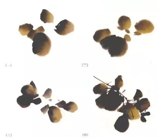 用藤黄加花青和墨色点出叶子,并注意叶子之间的主次、疏密、虚实的笔墨变化。