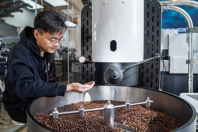 2025年12月10日,韩君玮在位于昆明的南来盛咖啡店内烘焙咖啡豆。