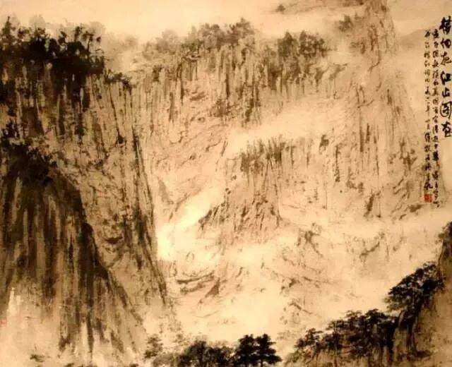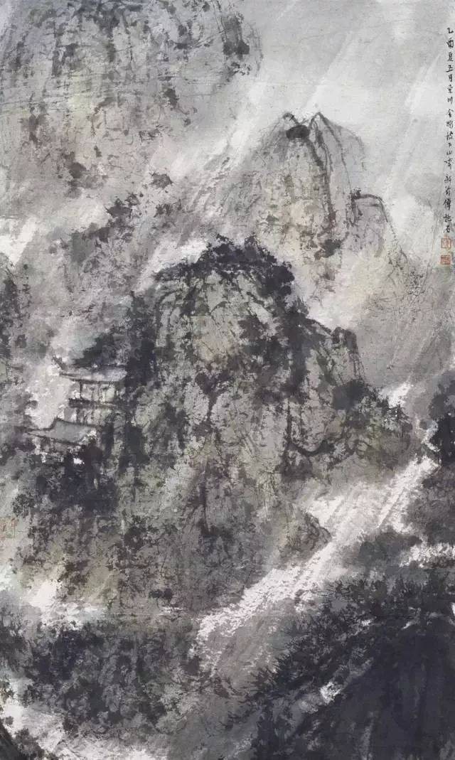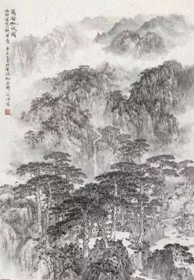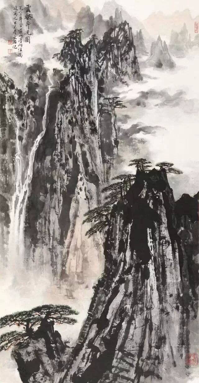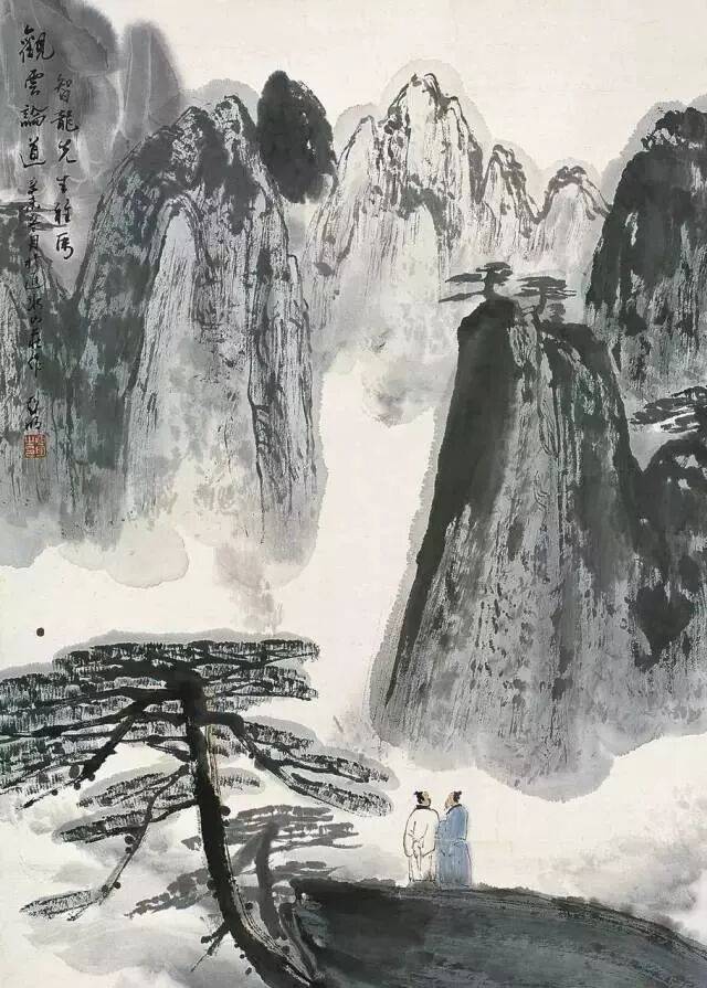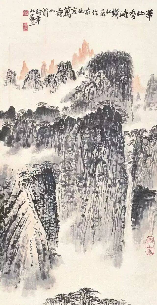 傅抱石用硬笔散锋轻皴,如风驰电掣,运生出华山横空出世的奇姿,变化多端的线条和长短相间的飞白,造就气象苍茫、云彩飞动、雾气迷蒙的微妙之境。诗人王昆仑有诗赞此画道:“丹青往代万千家,翘首今朝看异花。意动风来吹笔舞,江山无限走龙蛇。”