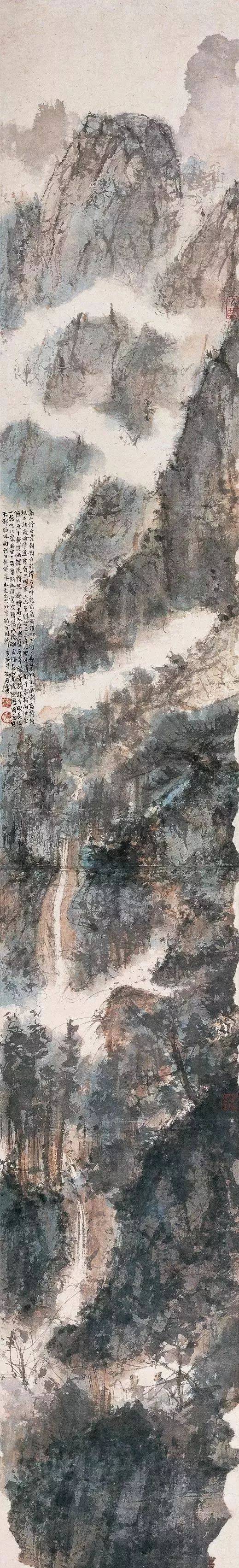 本幅创作于1945年,时年画家41岁,画中题跋为石涛在其画作《桃花源白龙潭》中所诗。傅抱石以长幅巨篇布局写意,无出其右者,有醉后作画的酣畅之态和童心见山的天真之趣。足为傅抱石盛年翘楚之作。