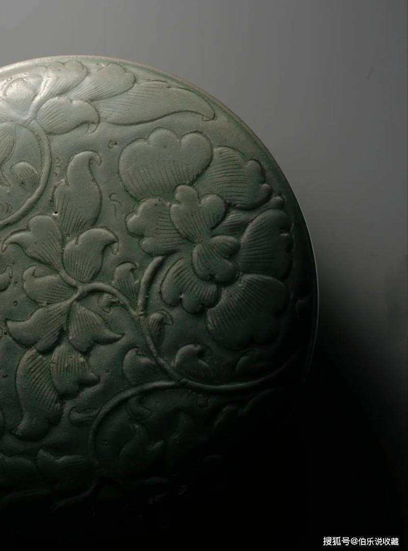 此件粉盒的釉色匀净萃雅、莹润如玉,与文献所载“秘色”特质高度契合,尽显古瓷美学的内敛之韵。器物整体端庄周正、线条规整,盖面以一圈弦纹界定纹饰区域,内施剔刻工艺雕琢缠枝牡丹纹——纹饰刻划清晰利落,凸似减地浮雕,枝叶舒卷灵动、线条细劲柔韧,周身蔓草缠绕蔓延,画面丰富而不失章法,布局疏朗有致。