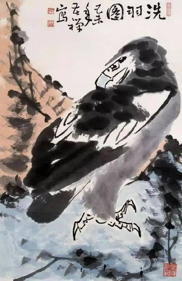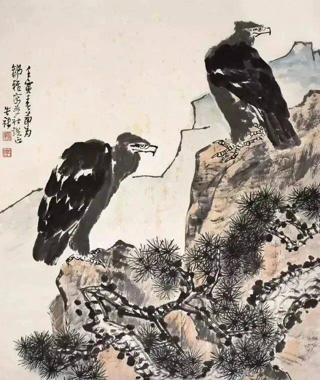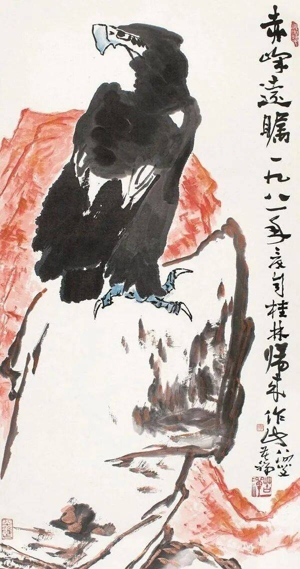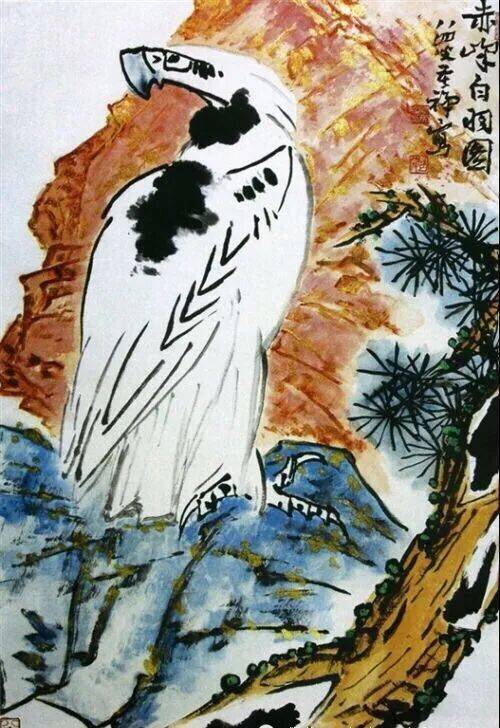 他笔下的鹰尤为大家所喜爱,最突出的是他画老鹰把鹰眼变方,更突出鹰的锐猛。八大山人、齐白石、徐悲鸿画鹰,眼睛仍是圆的,李苦禅则化圆为方,并且把鹰眼的比例增大,这是他的独创。