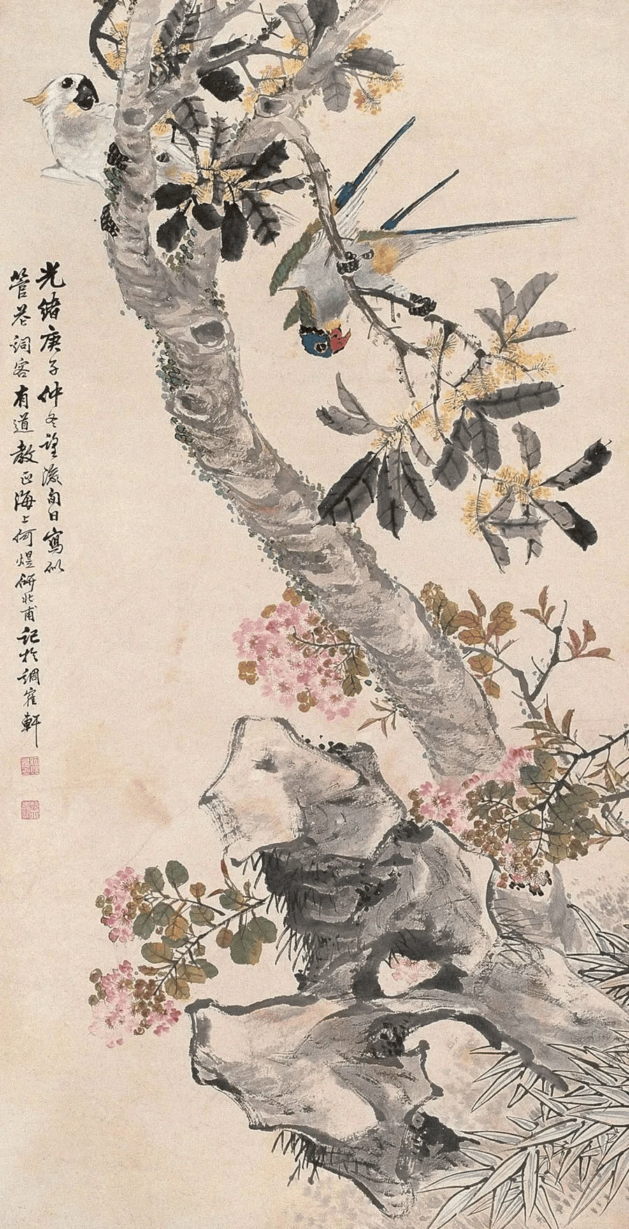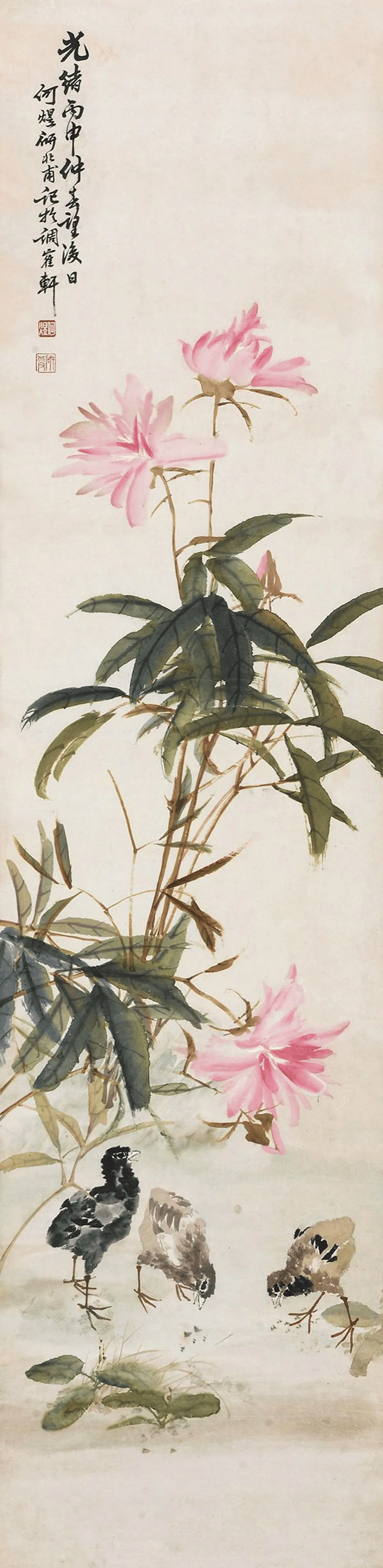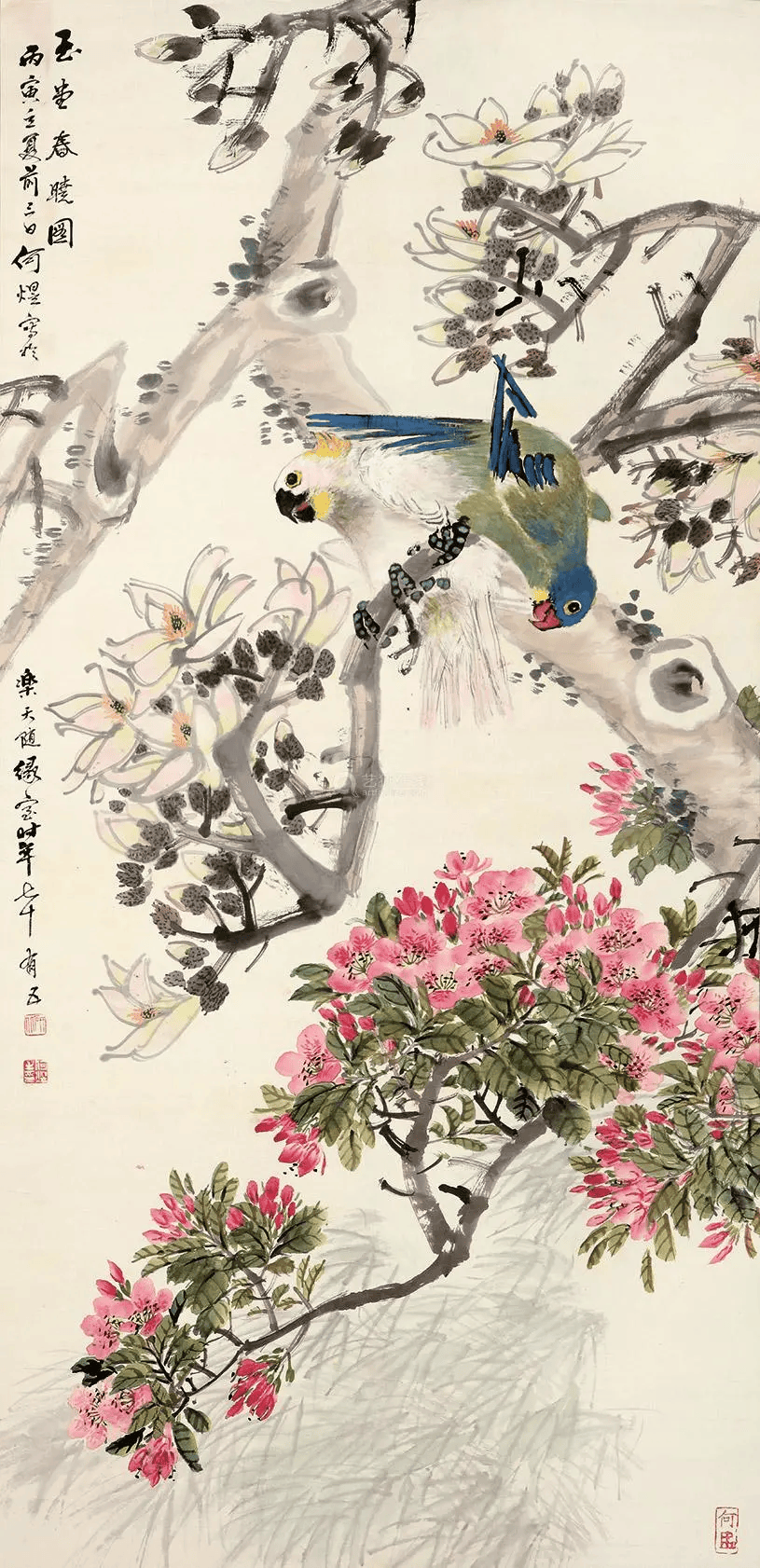 在清末民初的上海滩,何煜的花鸟画以“雅俗共赏”的独特魅力独树一帜。他笔下的花鸟,既非纯粹文人画的孤高清冷,亦非市井艺术的粗陋直白,而是巧妙地将市井烟火气与文人雅趣熔铸一炉,形成一种“热烈的雅致”。
