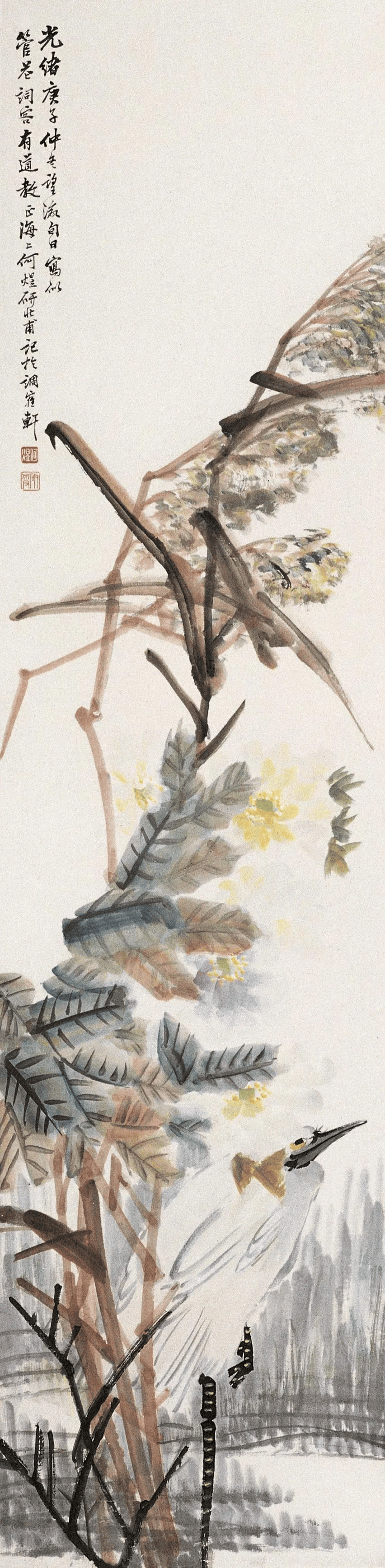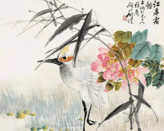 何煜深谙市民阶层的审美趣味,常以牡丹、仙鹤、白鹭等吉祥题材入画,赋予画面喜庆氛围。如《海鹤添筹图》中,仙鹤衔筹飞向礁石,背景淡墨渲染海浪,既暗合祝寿主题,又以“三长”(喙、颈、腿)的精准刻画展现鹤的仙风道骨。而《红荷白鹭图》则以白鹭与荷花并置,构建“一品清廉”的隐喻,满足民间祈福需求。
