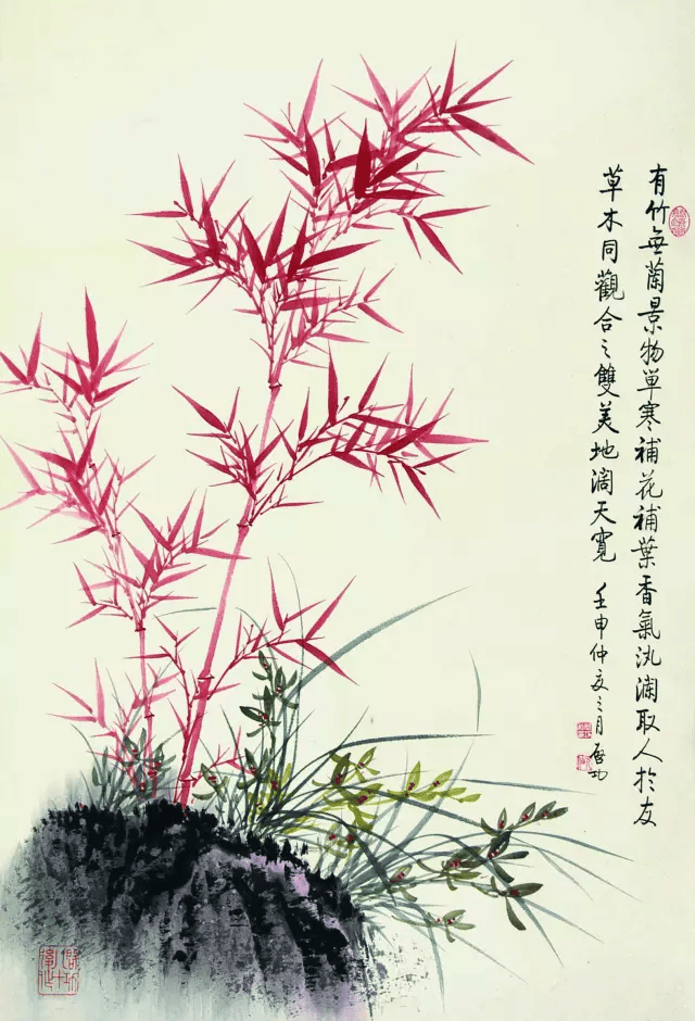 画雨竹枝略弯,叶下垂偏一边。“个”字“介”字相互破,各种分字画其间。行笔提按需求稳,出锋必须要果断。有主有宾分成组,整体还需连成片。密处求疏疏处密,最忌堆砌和散乱。画竹关键在组合,功夫都在笔墨间。