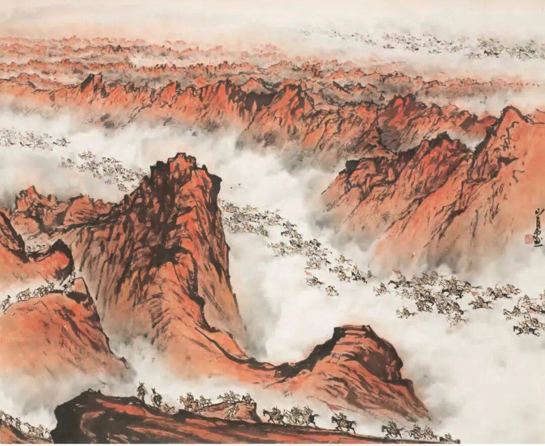 《快马加鞭未下鞍》是关山月以毛泽东诗词《十六字令三首》中的“快马加鞭未下鞍”意境为题材创作的作品,完成于1963年。作品以全景式的宏大构图,再用中国散点式与西洋焦点式结合的表现手法,表现出一种广阔而宏大的场景。作品中,关山月以大笔挥洒的笔墨构成有力而坚实的山体,与奔腾回荡的战马和山岭的大块墨色形成对比,将情绪表达上的强烈气概很好地表现出来,让观众感受到那博大的胸怀和容纳天地万物的气度。关山月所用的红色调,更加凸显特定时期中国画对豪迈、热烈、雄浑的笔墨风格和画面境界的追求,强化了红色山水所要求的革命气度与宏大的情怀,是一幅将革命现实主义与革命浪漫主义很好结合起来的文艺作品。