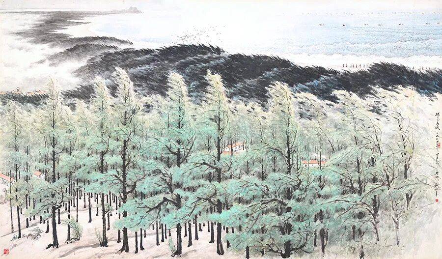 《绿色长城》描绘了20世纪70年代粤西的沿海风景。海边通常是风沙带,作物难以生长。新中国成立后,党和政府提倡植树造林,南方的海疆也种起了木麻黄林。木麻黄树生长在海边沙岸上,防风固沙,还用其“身躯”阻挡狂风巨浪的冲击,保卫身后的家园和农田。关山月的家乡在粤西海滨。1973年,他到粤西电白县虎头山脚下的民兵哨所住下,和民兵一起生活,并多次写生记录,为创作积累了珍贵的一手素材。茂密的木麻黄护林带在海风吹拂下层层起伏,与海浪遥相呼应。近处的树迎风而立,与远树一同构成一道道绿色屏障,而在海滩边上,有一排正在巡逻的民兵,说明了这是海防前线,需要时刻准备战斗,保家卫国。这幅作品表现出具有南方海岸风情和时代色彩的“长城”。