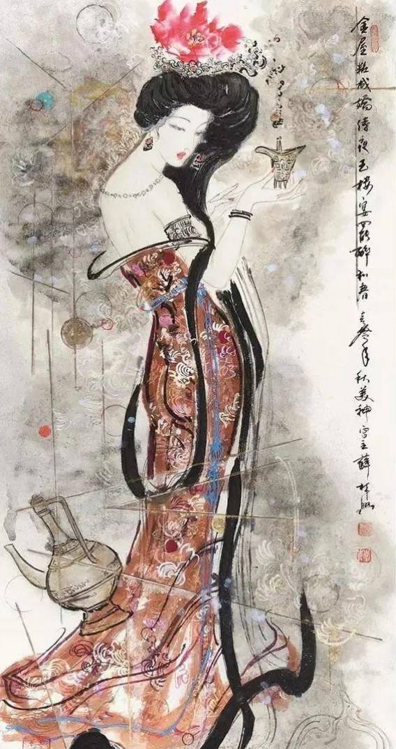 在他的“东方美神”系列中,无论是《贵妃醉酒》的雍容,《洛神》的飘逸,还是《山鬼》的神秘,都已超越传统仕女画的程式。