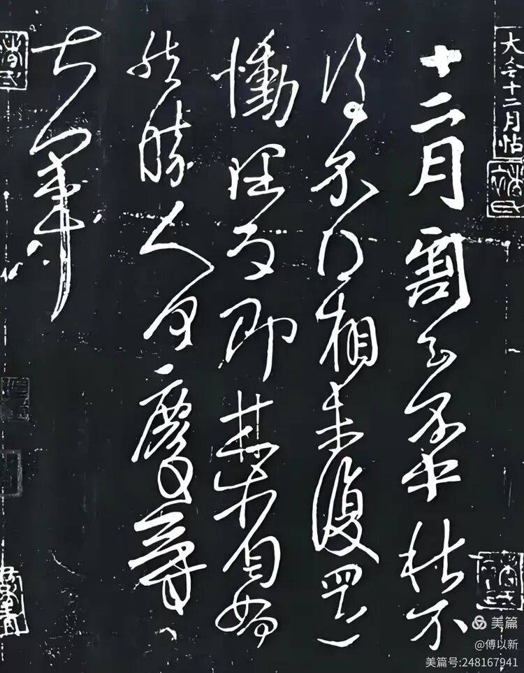 《十二月帖》如今只见拓本,它最早刻入南宋《宝晋斋法帖》。 宝晋斋是北宋米芾的斋号,因他收藏了东晋谢安和王羲之一门的书法而取名,其中就有《十二月帖》。此帖神采飞扬,连绵跌宕,米芾赞为“天下子敬第一帖”在他身后刻入了《宝晋斋法帖》,但其艺术性则逊于《中秋帖》。《十二月帖》虽比后来的《中秋帖》多了几个字,但同样难以判读,尽管有唐褚遂良印, 但原作也应该是被“割裂”的响榻本。