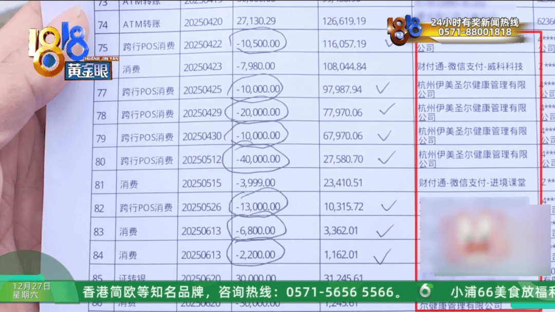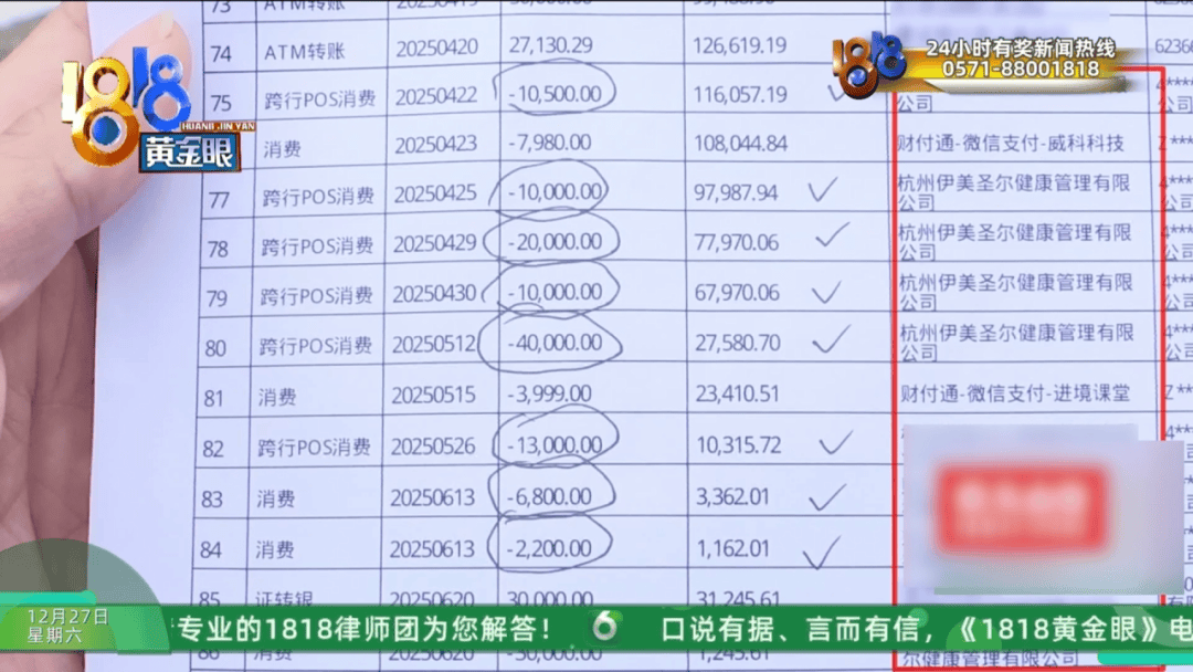 2024年没有养生消费记录,2025年4月到6月,几乎每隔几天就好几千、一两万、三四万地通过POS机消费或者微信转账,收款方都是“杭州伊美圣尔健康管理有限公司”。