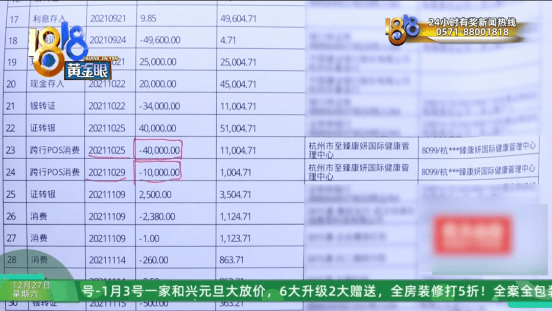 12月7号又刷了五万七千元给这家机构,到了2022年11月21号POS机消费两万九千元收款方是“杭州市拱墅区臻康养生馆”,12月26号又在这家养生馆消费了一万五千元。