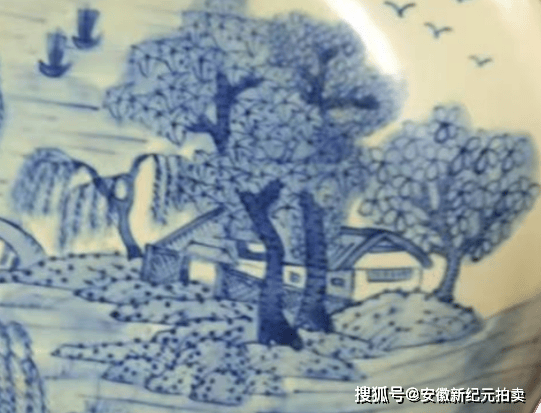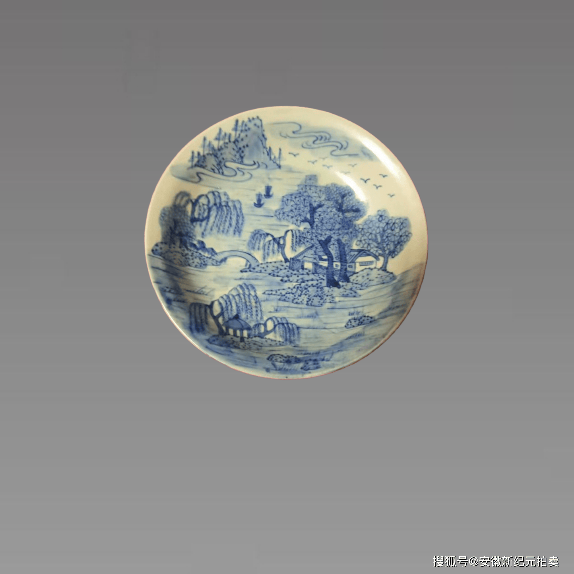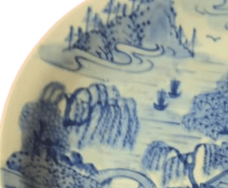 此藏品以中式“隐逸山水”为核心题材,完整呈现了文人画的经典意象:远景层叠山峦伴云气缭绕,中景垂柳依河、屋舍临岸,搭配小桥与行舟,近景则以奇石矮树铺陈,天空飞鸟点缀其间,整体遵循国画“三远法”构图,借疏密虚实的景物排布营造出“咫尺千里”的意境,是传统文人“寄情山水”审美情趣的具象化表达。它既反映了清代以来“市井文人化”的审美趋势,也以实用器物的身份,让青花工艺、山水题材等文化元素在民间得以延续和传播,成为连接精英文化与民俗生活的纽带。具有较高的收藏价值和文化艺术欣赏价值!
