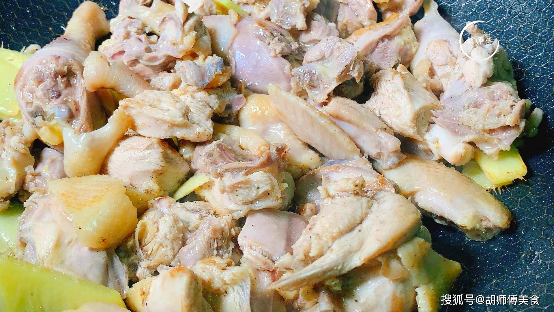 第三步:锅中放入一勺油,然后将老母鸡和老姜放入锅中,大火将老母鸡炒5分钟左右,直到鸡的表皮有一点点变皱,就可以了,新鲜鸡不要焯水,焯水就没鲜味了,简单炒一下,吃着更香。