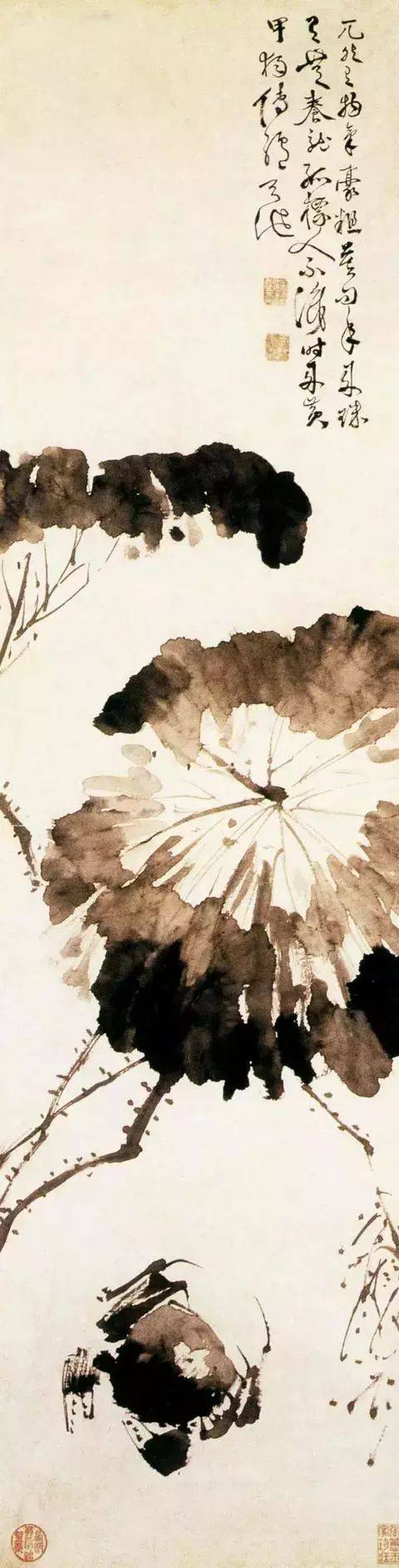 此图用笔峭劲挺拔,以奔放而精炼的笔墨写出螃蟹的爬行之状和荷叶萧疏的清秋气息。蟹的造型,虽寥寥数笔,却浓、淡、枯、勾、点、抹诸多笔法参用,质感、形状、神态历历具足。覆在上面的荷叶,笔阔气贯、偃仰有致,点画之外更寓无尽秋意。是徐渭的一幅杰作。