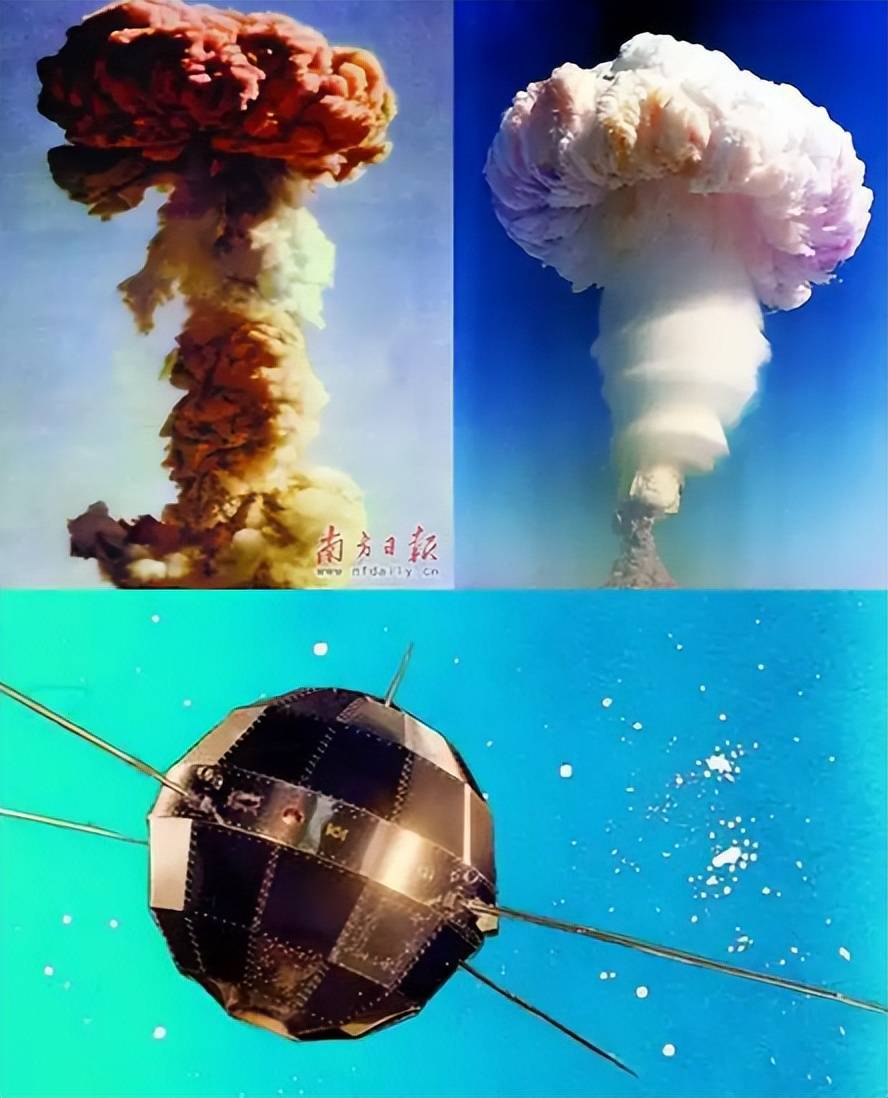 1964年10月16日,中国第一颗原子弹爆炸成功;1967年6月17日,第一颗氢弹空爆试验成功;1970年4月24日,第一颗人造地球卫星“东方红一号”发射成功。