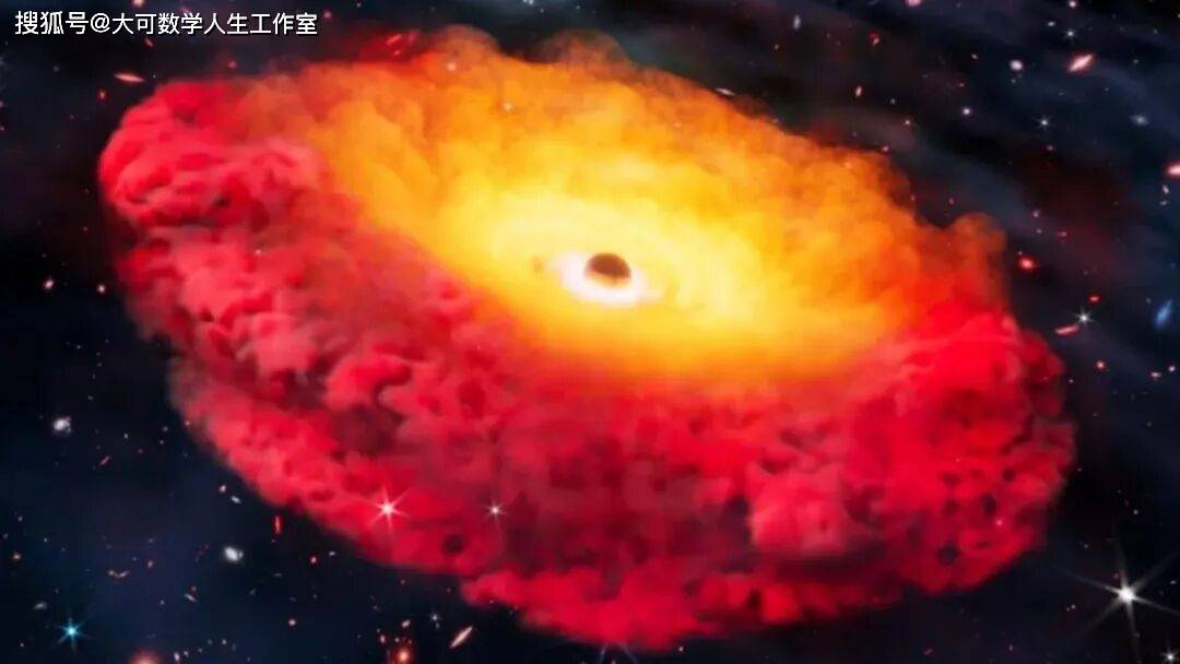 詹姆斯·韦伯太空望远镜观测到了迄今为止确认的最早的黑洞(图中中心球体)。它周围可能环绕着高密度气体,这些气体可能会改变为这个不断增长的天体提供物质的光线。(图源:Erik Zumalt/University of Texas at Austin)