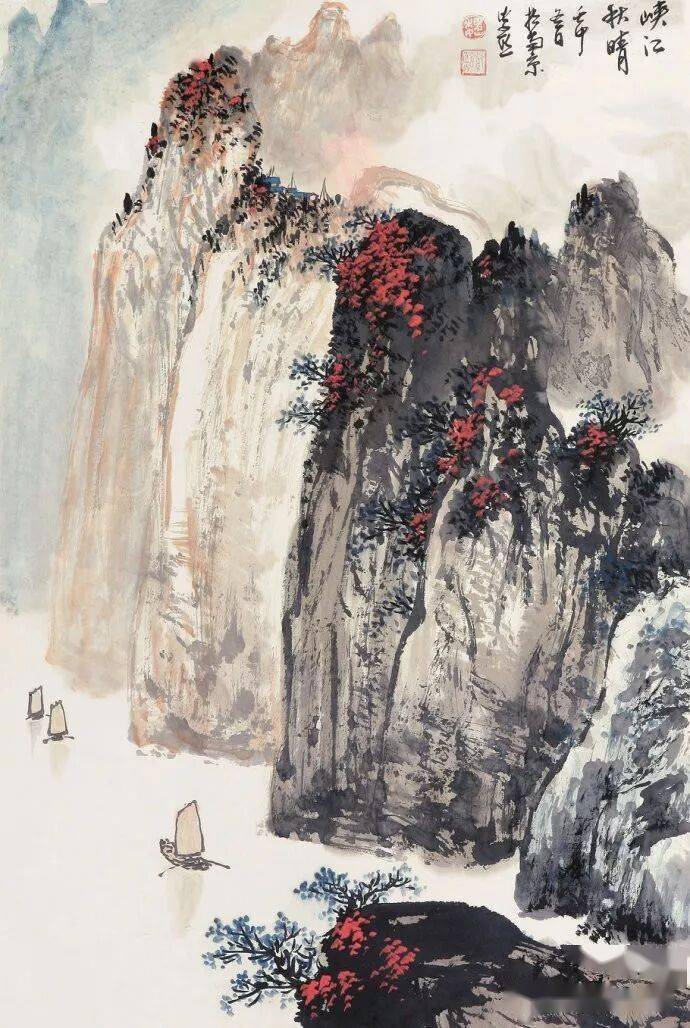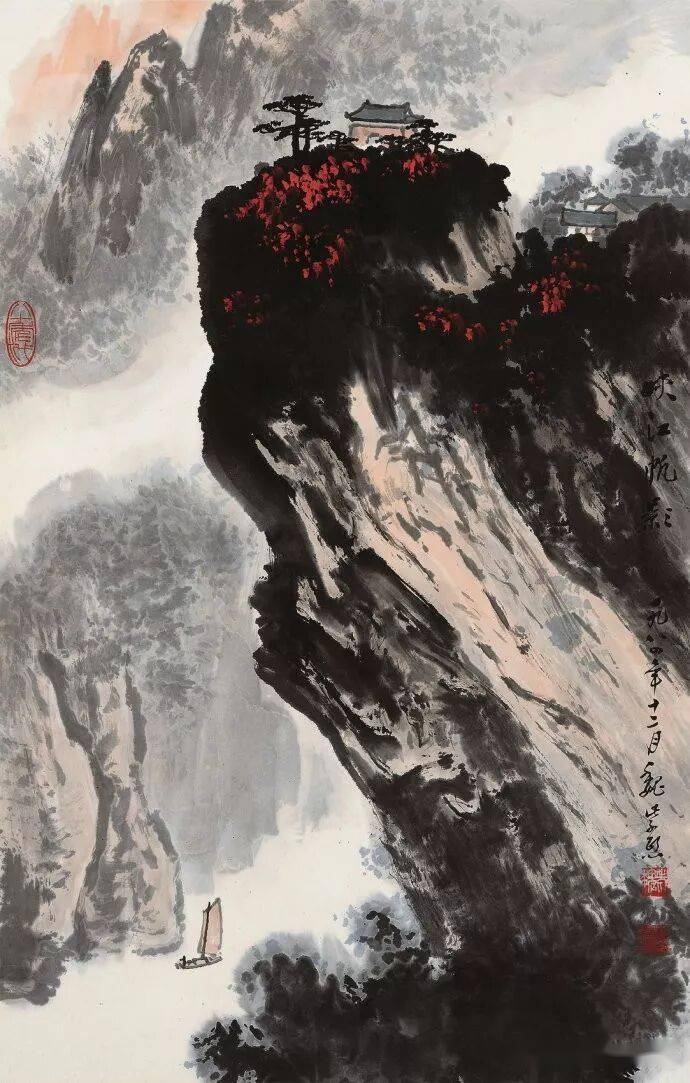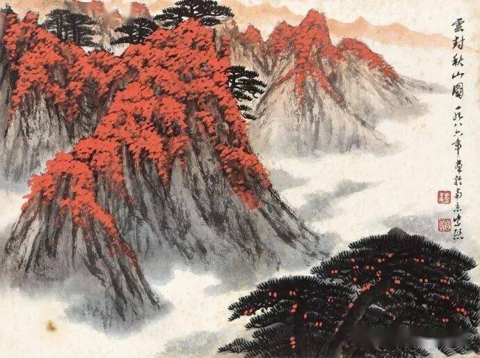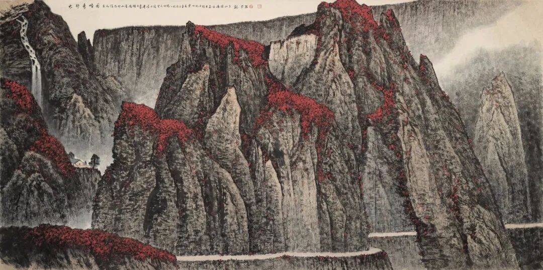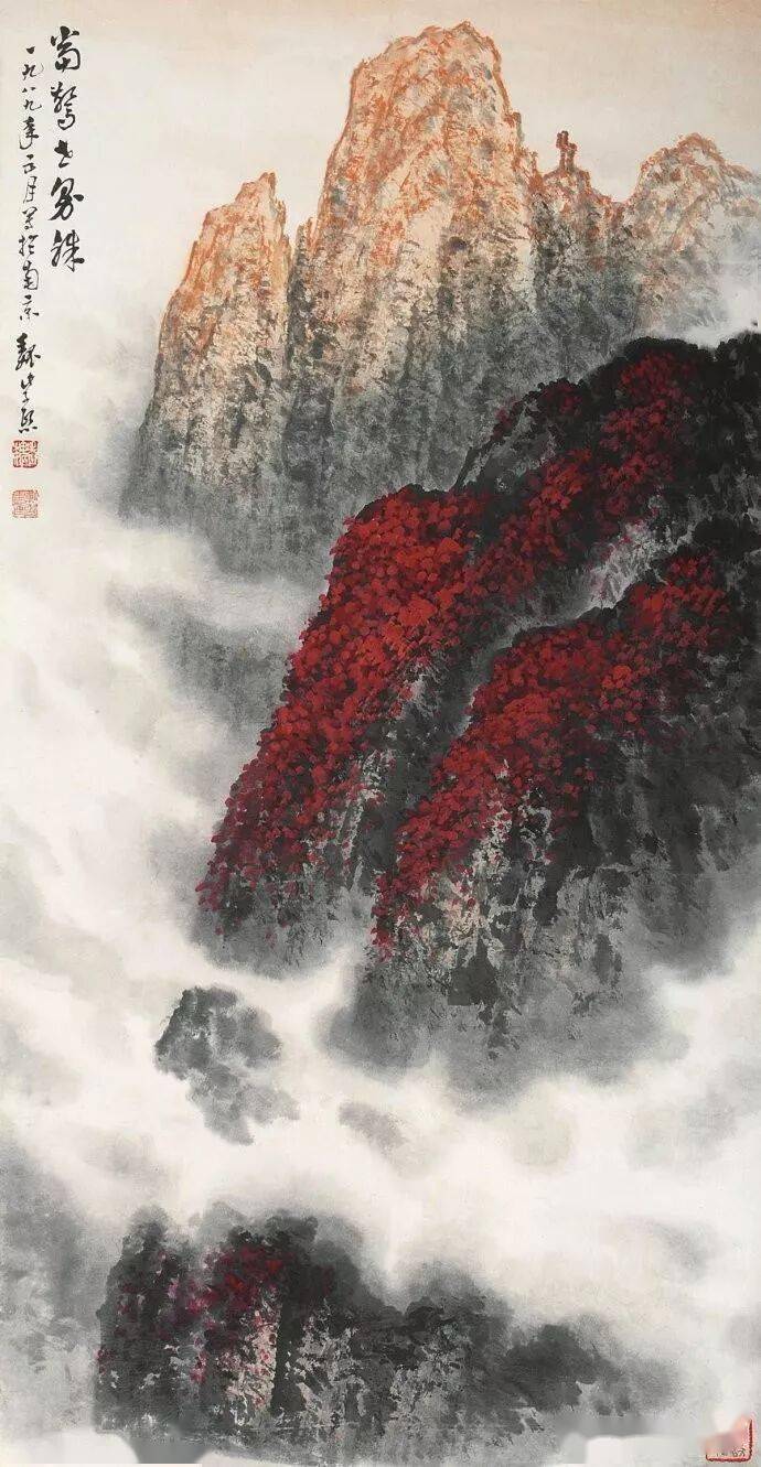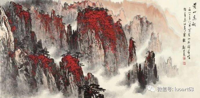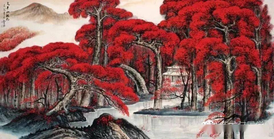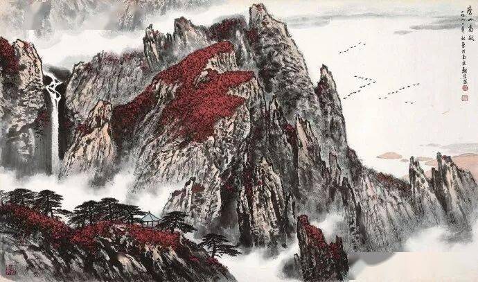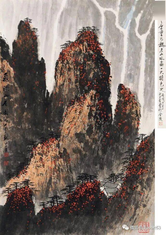 晚年山水画无论是题材,还是技法都取得了突破性的进展,大面积泼墨和重彩朱砂点的运用,既传统,更现代,画风显得异常新颖。