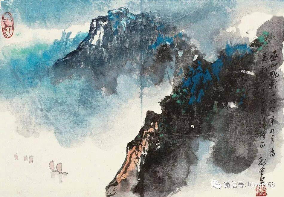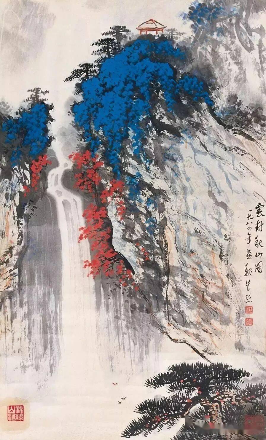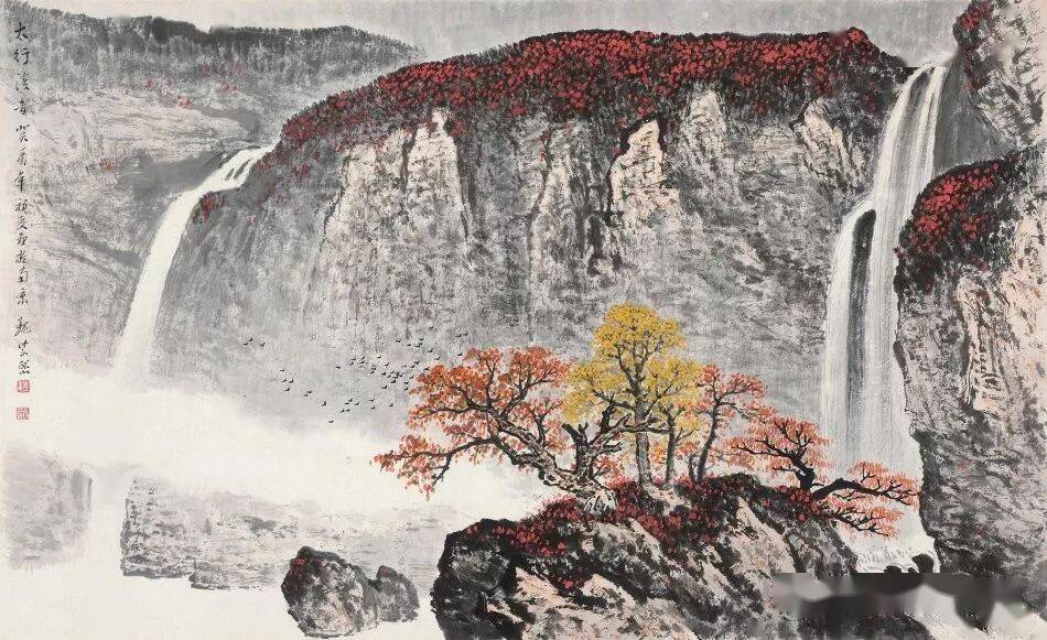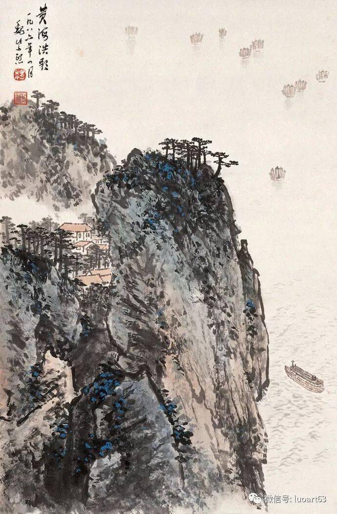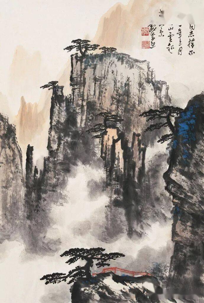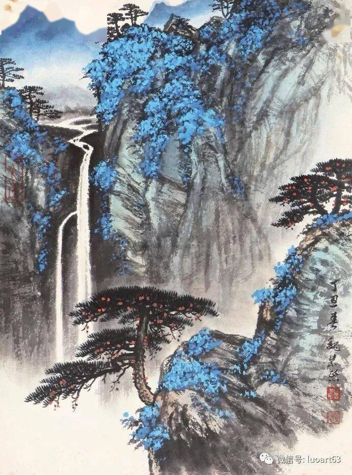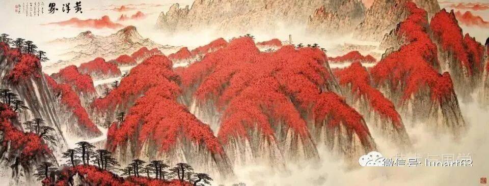 晚年山水画无论是题材,还是技法都取得了突破性的进展,大面积泼墨和重彩朱砂点的运用,既传统,更现代,画风显得异常新颖。