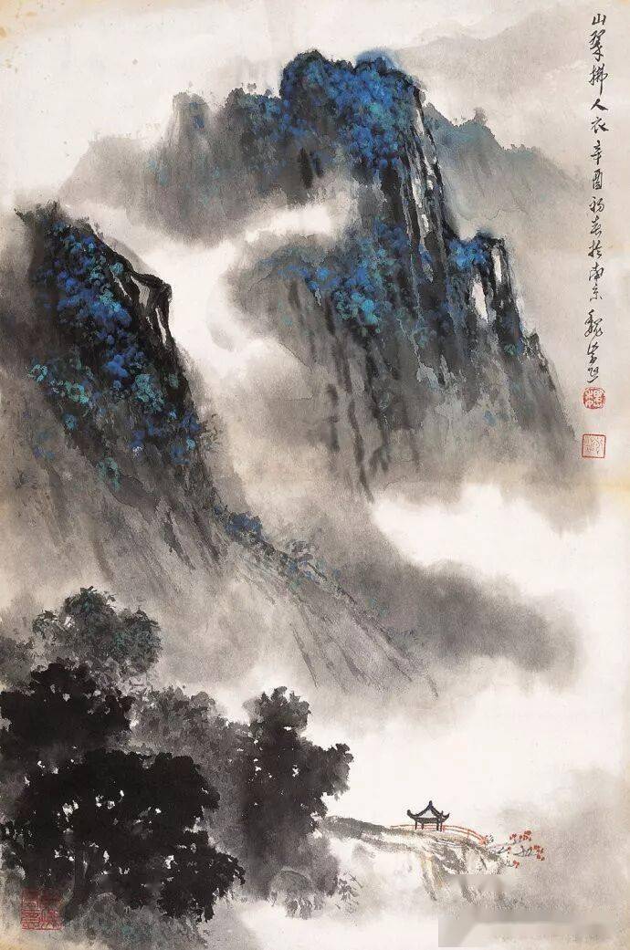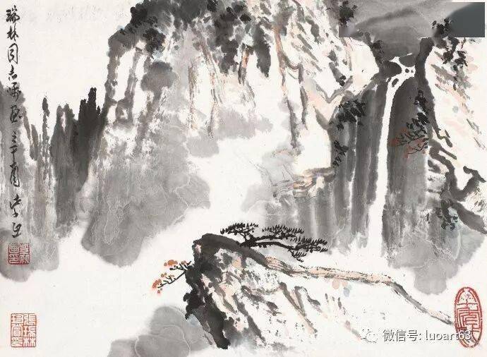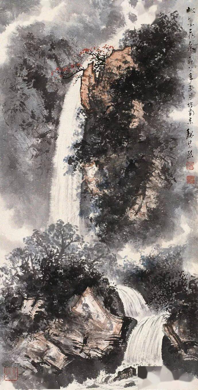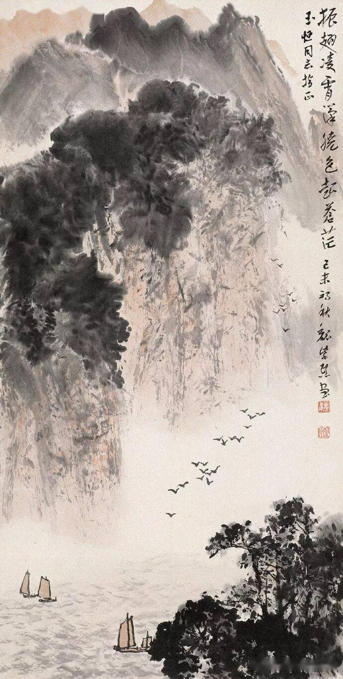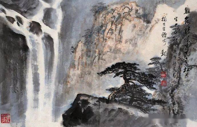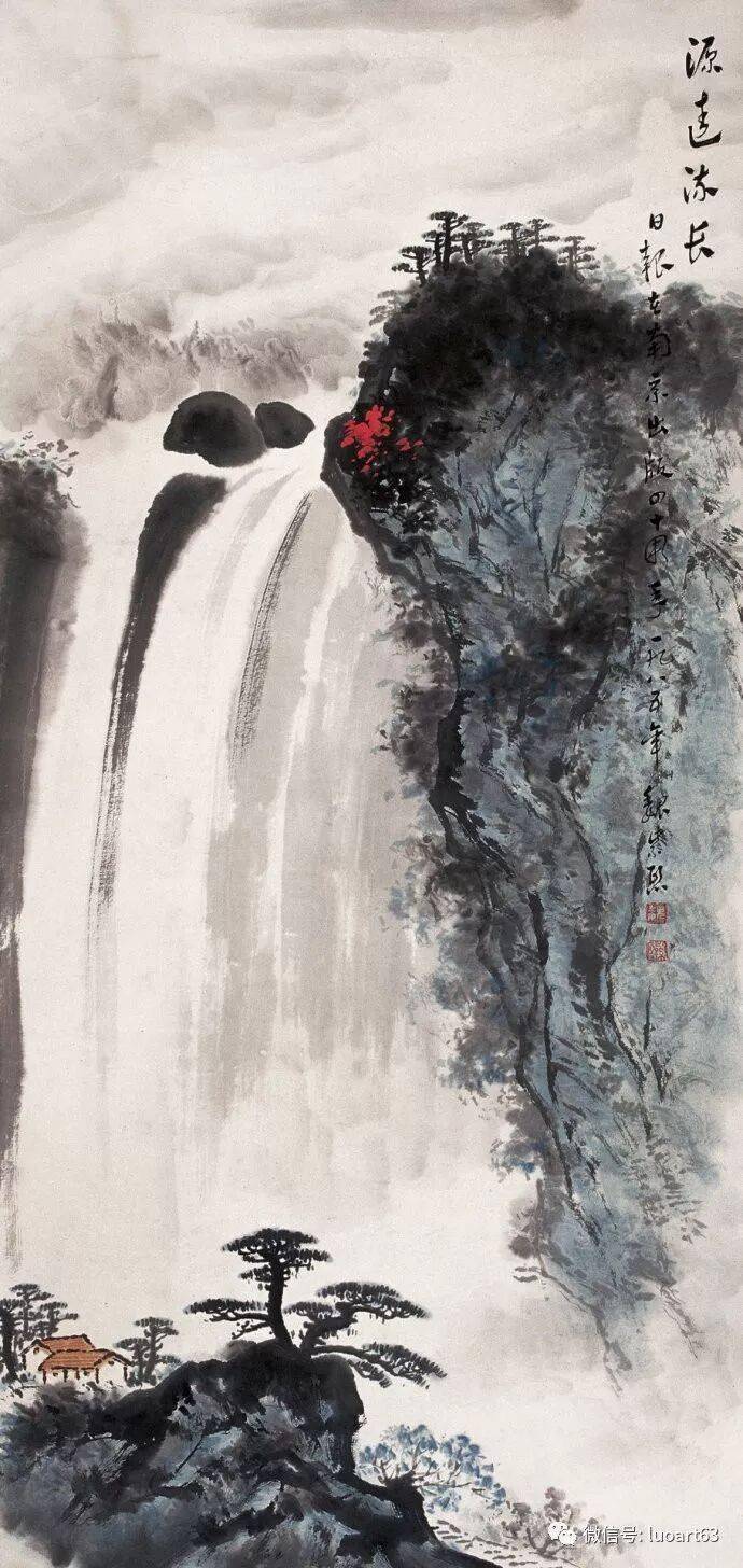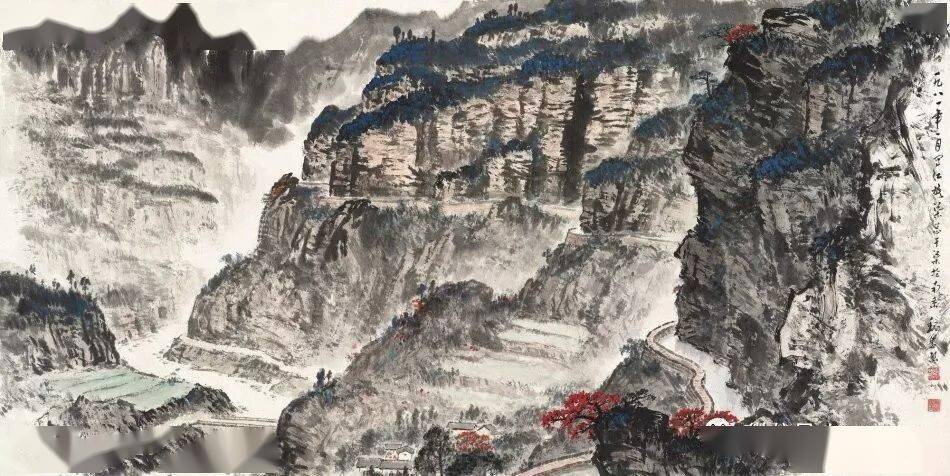 晚年山水画无论是题材,还是技法都取得了突破性的进展,大面积泼墨和重彩朱砂点的运用,既传统,更现代,画风显得异常新颖。