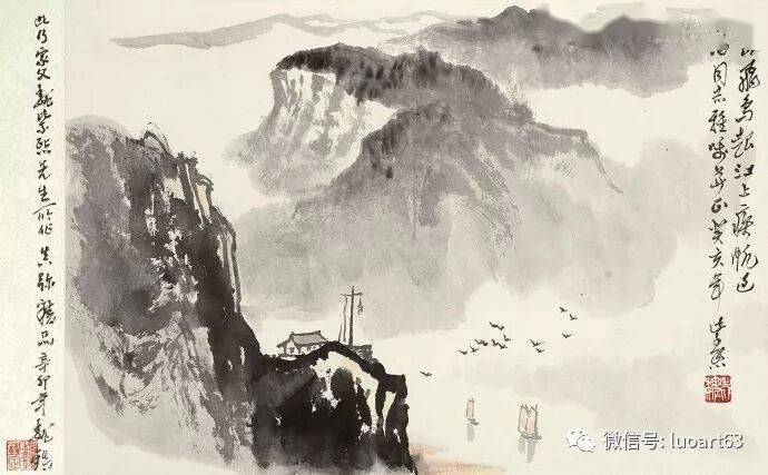 山水画,无论浓重或者淡雅,都要给人以一种苍苍茫茫之感,特别是大幅画中,如能画得使人有苍茫之感,这幅画必然能够气势雄伟,深邃厚重,引人入胜。当然也要注意到构图的布局。苍茫,一般也就是落墨时用笔要干一些,毛一些。先搭好墨骨,浓淡得宜,染色时水分再多,也必然有苍茫之感。