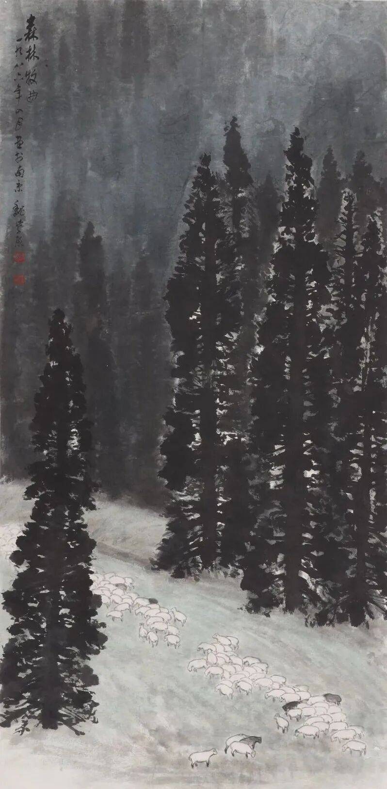 总的说来我们现代山水中所画的树都比古人画的概括一些,粗犷一些。松树在山中比较突出。其本身比其他树浓重,姿态变化又多。特别是松枝的苍劲之处容易跟山石结合,因此在我的画中松树画得比较多,往往只用松树或略加几株杂树点缀在山石之中,更增加苍茫厚重之感,其他许多各种各样的树都用点来代替了。