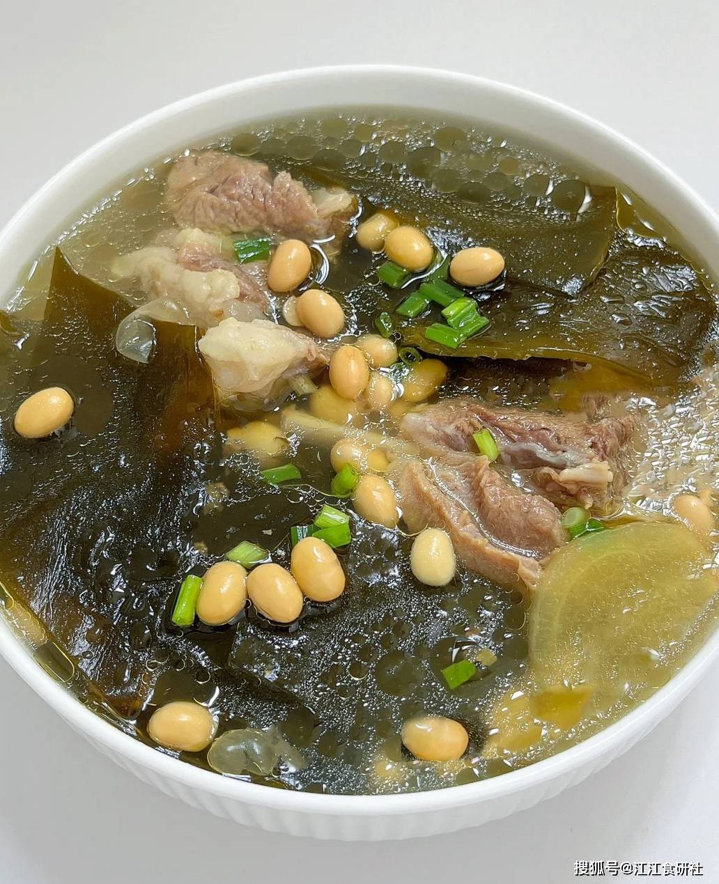 用猪骨和海带、黄豆一起炖汤,是绝配。猪骨提供脂肪和鲜味,让汤变白变浓。海带和黄豆的加入,则让这碗汤变得“清爽”不油腻。