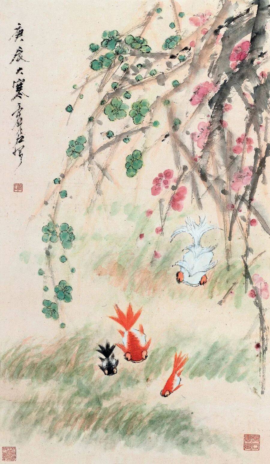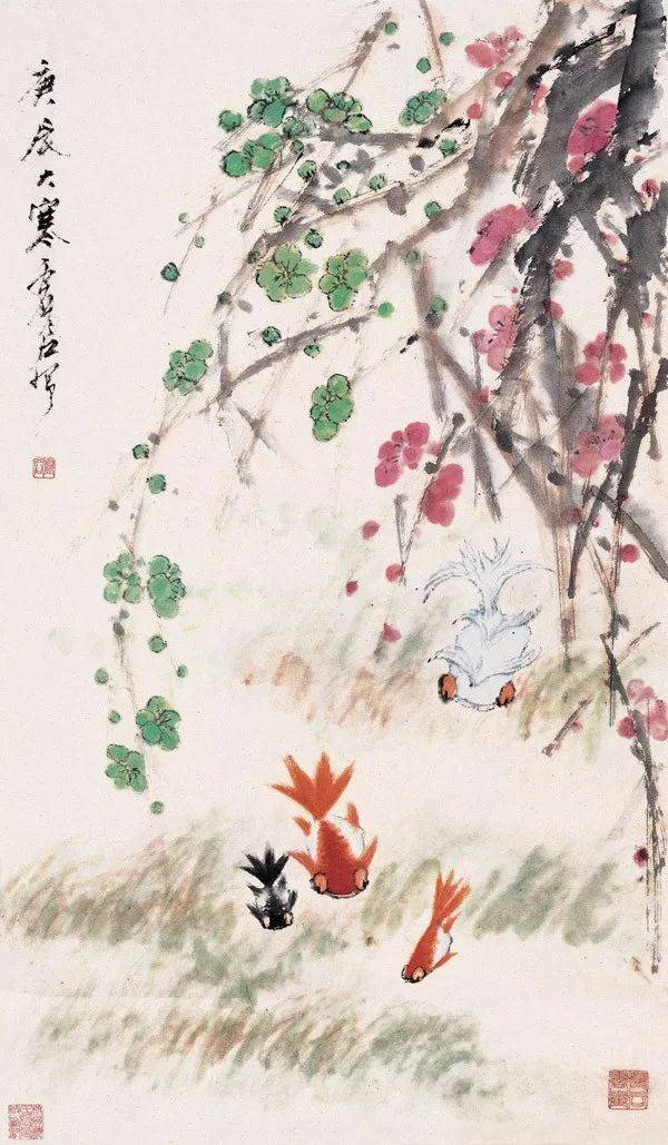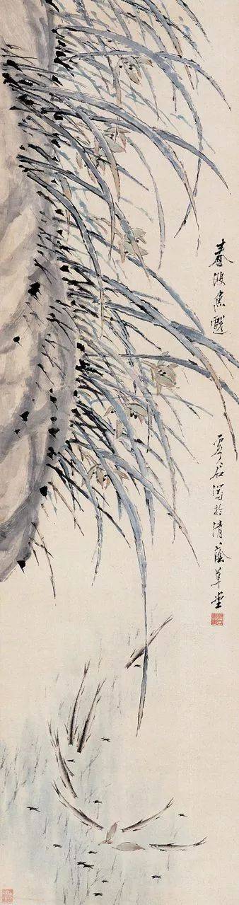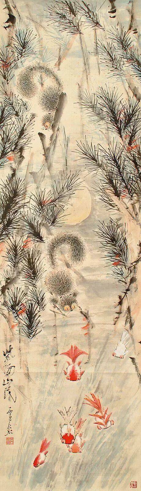 虚谷和任伯年以及吴昌硕是近代海上画派中的代表人物,被称为“海上三杰”,从晚清开始他们联手将绘画艺术推至艺术顶峰,虚谷以其造诣卓绝的形式之美尤为突出,开辟了写意画之新时代。吴冠中曾经对虚谷的写意画有过高度评价,他说虚谷眼中的形象世界是十分鲜明突出的,其特别擅长在具象中抽象出美的旋律,能够发现画面中的其他美,这是前人未曾做到的。比如在虚谷的关于鱼的题材当中,很多方形的鱼和圆鼓形的鱼。回头看虚谷的《水草白鲦》,七八尾白鲦,如箭、如叶,呈对角斜势游来,画家捕获了鱼在运动中的弧线状,强调了一种速度与量感美,这为后人进行花鸟画的构图给与了深刻的启示。