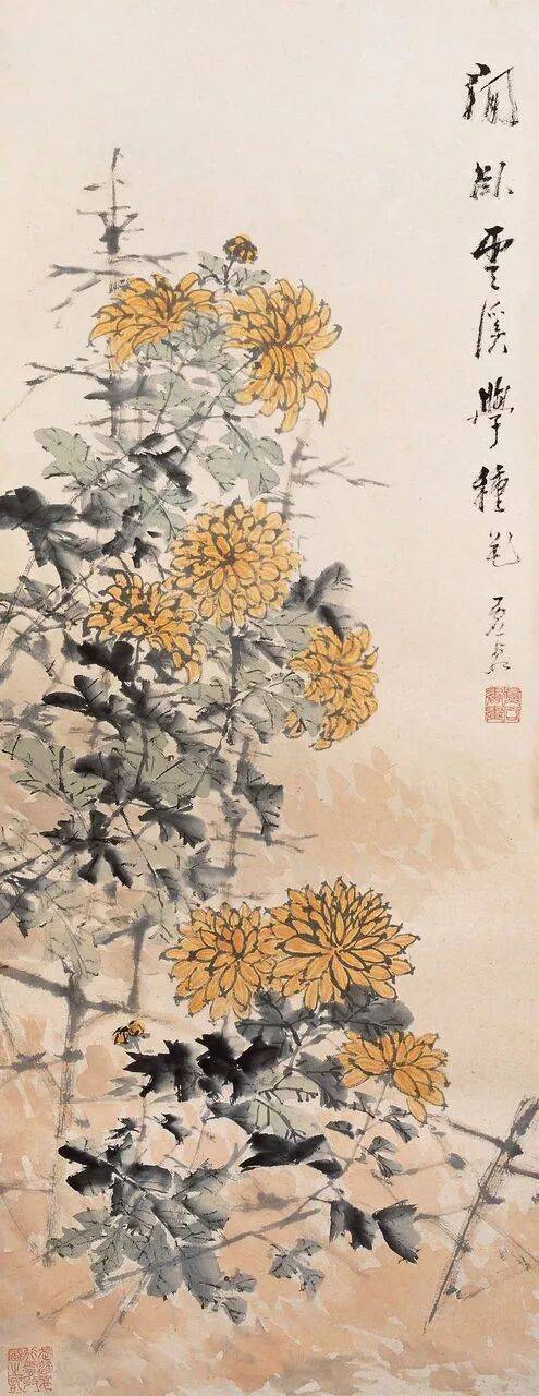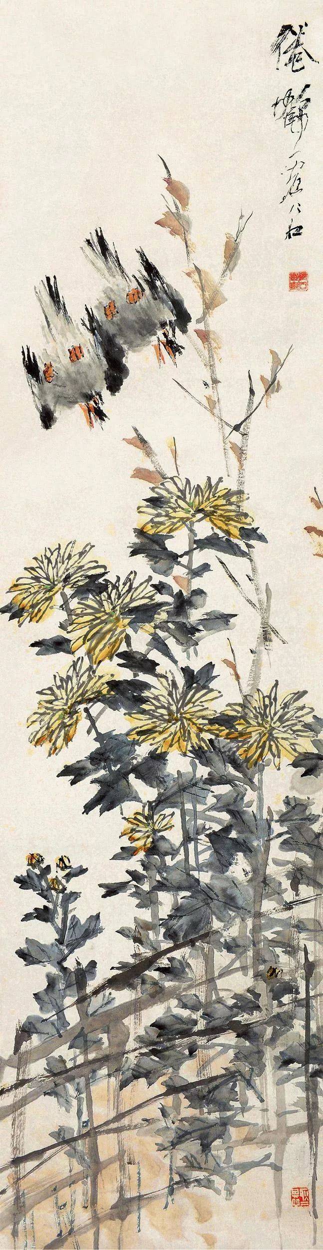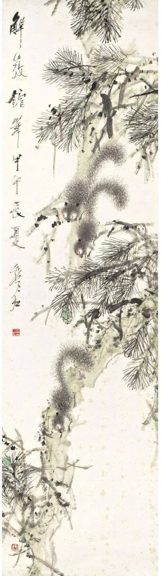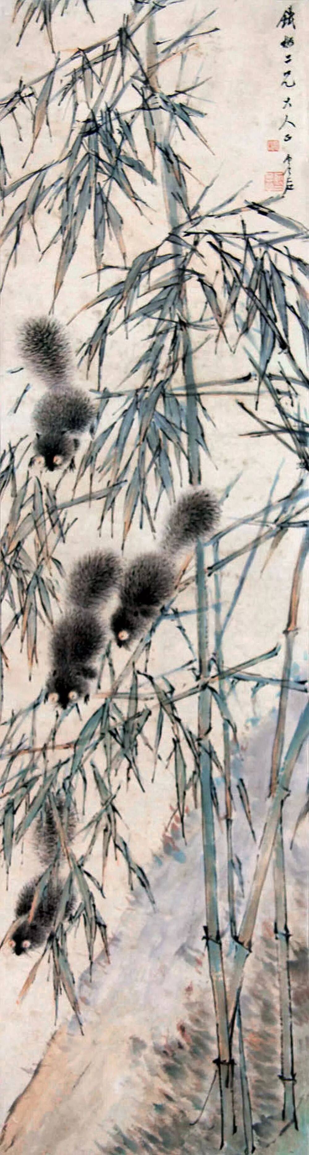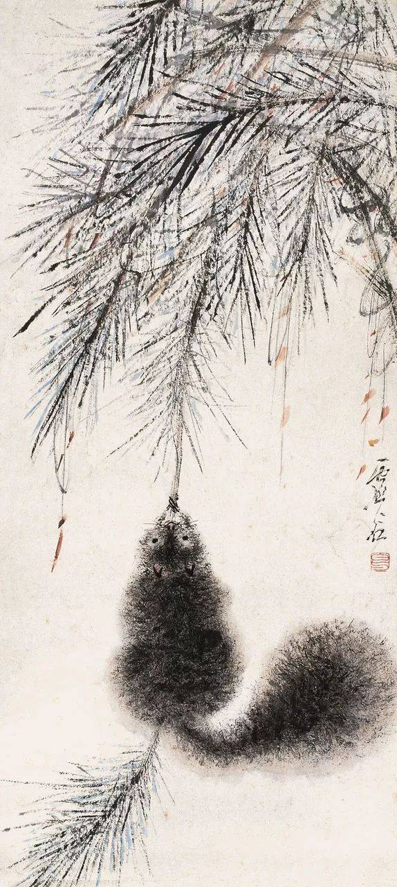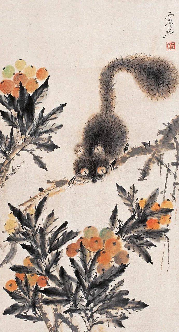 虚谷不少的花鸟册页都能够在画面中心突出整体结构形象,或者从某一点展开向四周扩散。比如一只松鼠几乎从对角交叉的中心开始上下几笔完成。其作品《满架秋风》中,在画的中间画了几个扁豆就像在风露之中四面凌空,感觉像是四面来风一样,布局独具特色。虚谷的花鸟画当中呈现出了金鱼、松鼠以及菊花等事物,都分布在垂直轴线当中,特别是展示出了一种下垂或者上扬的态势,比如其表现的梅花、金鱼和松鼠等,以一以贯之的特点强烈的表达出了个性特点和震撼人心的力量,在他的动物题材当中金鱼和松鼠占比最高,也是在垂直线上分布,例如,北京故宫博物院藏的一幅《绿竹松鼠图屏》中,繁茂的绿竹林间,三只大小相近的松鼠,由上而下俯冲而来。咋一看,仿如一只松鼠快速向下窜的慢镜头呈像所得,而呈垂直之势。此外,在对花卉和植物的表现方面,更多的是垂直挺拔的气势,比如竹子和梅花枝等,尤其是后者在冰天雪地当中的姿态呈现出刚直气势,虚谷线条的运用在这方面表现的淋漓尽致。