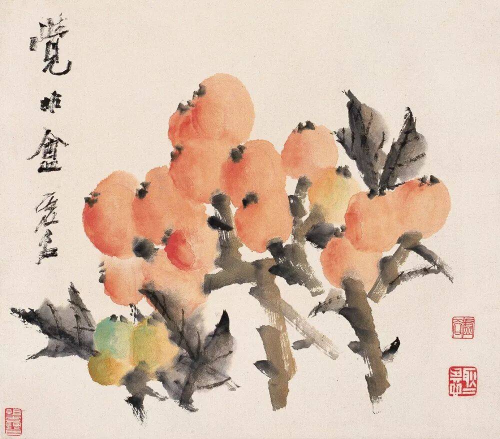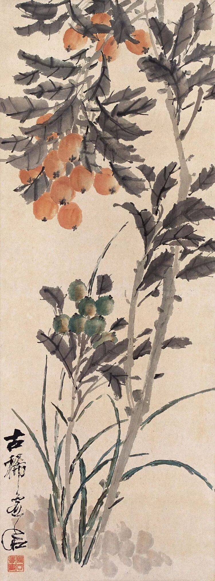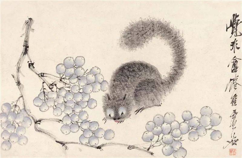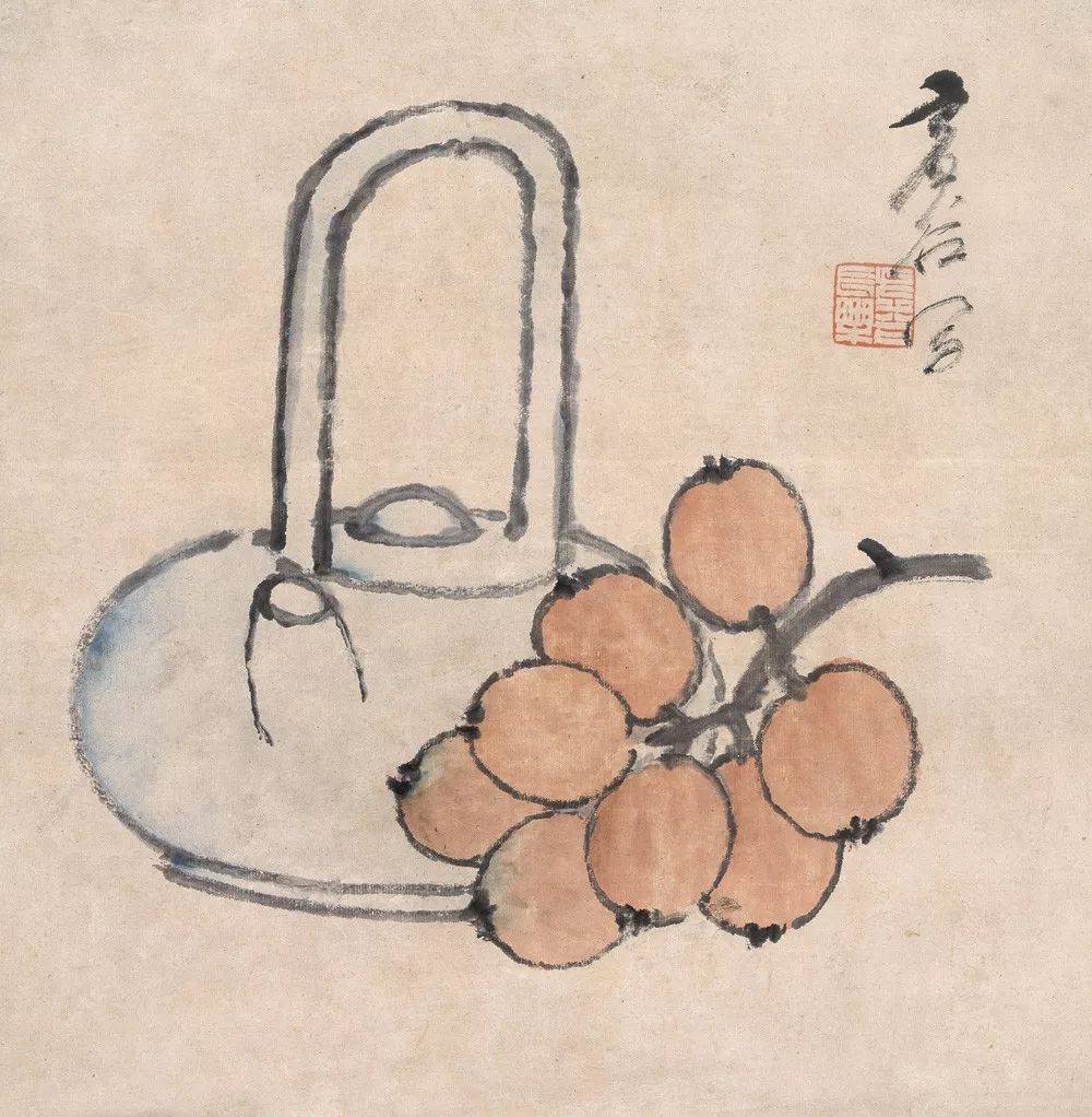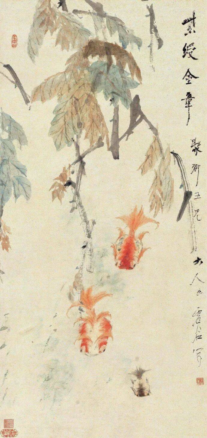倘若说虚谷的造型处理是在做减法,那么在整体的画面布局上就像是乘法和加法一样,其十分重视画布中物和物之间的联系,特别擅长使用重复排列组合,比如首尾相连的松鼠和鱼类以及花朵、兰草、叶子等,都是从具体的事物中抽象概括出来的。他的著名作品《柳条鱼》当中,画幅中,一群鱼,大小形状相似,似柳叶,似青条,七八尾、十来尾,仿佛从一个模子里刻出来。扬州市江都区博物馆藏的虚谷《花鸟图》,在运笔用墨方面又独辟蹊径,颇为个性化,以方写圆、以拙取巧、以逆取势,可谓是艳色、枯笔与变形的交融。虽然不同类型的作品当中都有不同的符号化语言,不过在整体的感觉处理上,不同符号化语言并没有走向形式主义的表现,其十分重视内在精神表达,也就是升华整个画的主题,虚谷所看到的果实或许对他来说不仅仅是果腹的,他看到的金鱼也不仅仅是用来欣赏的,他所用绘画表现出来的,始终是跟他所接受的佛家思想有着莫大关系。